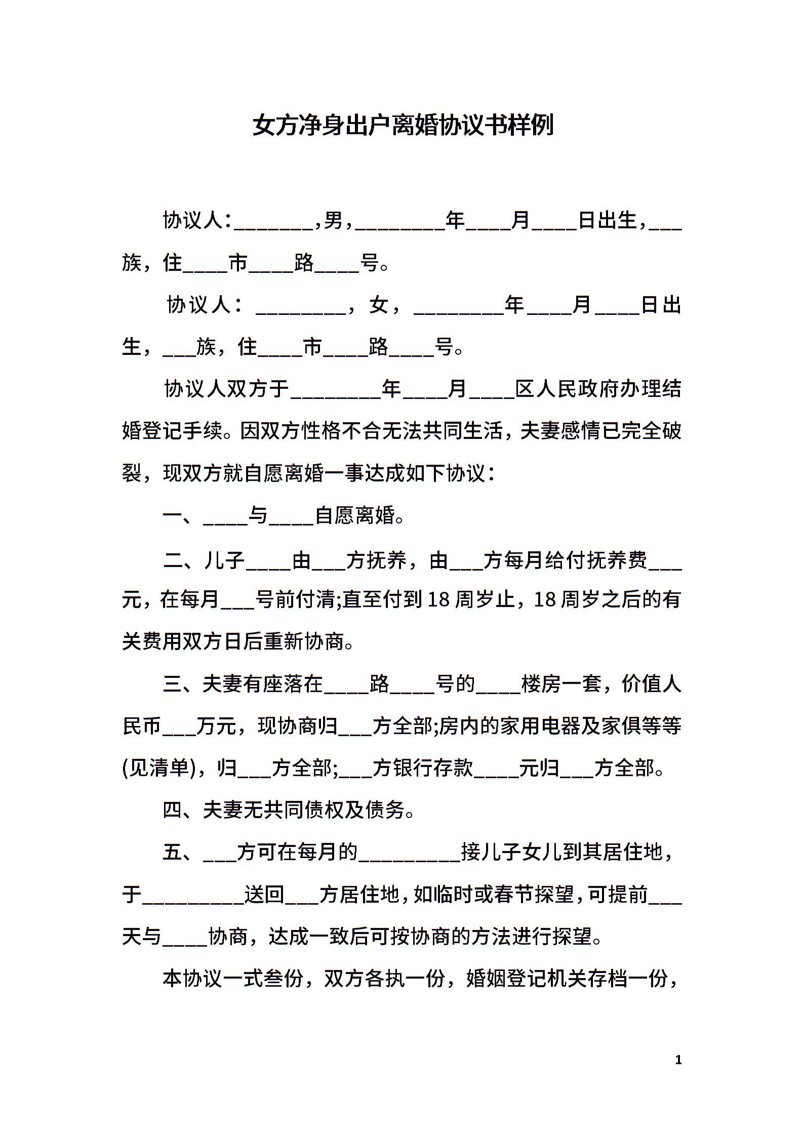 女方净身出户离婚协议书样例