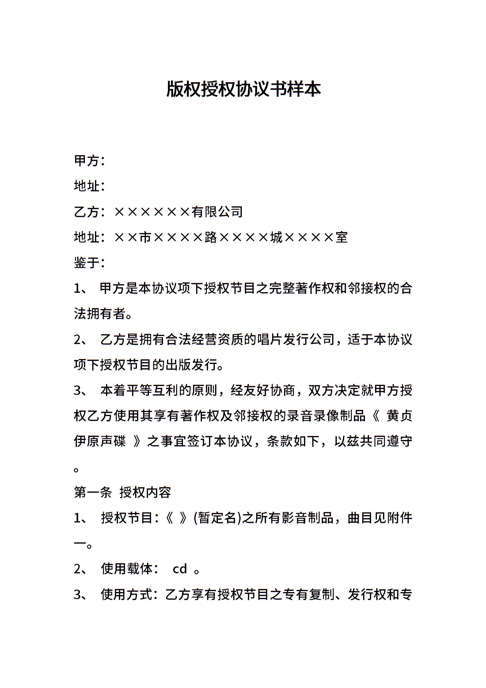 版权授权协议书样本