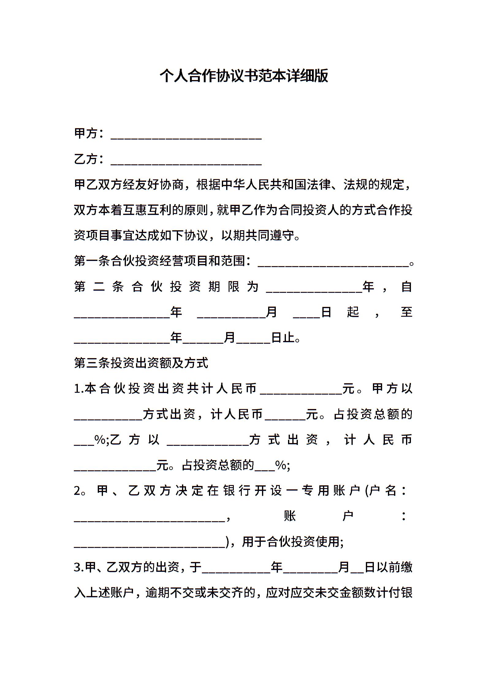 个人合作协议书范本详细版