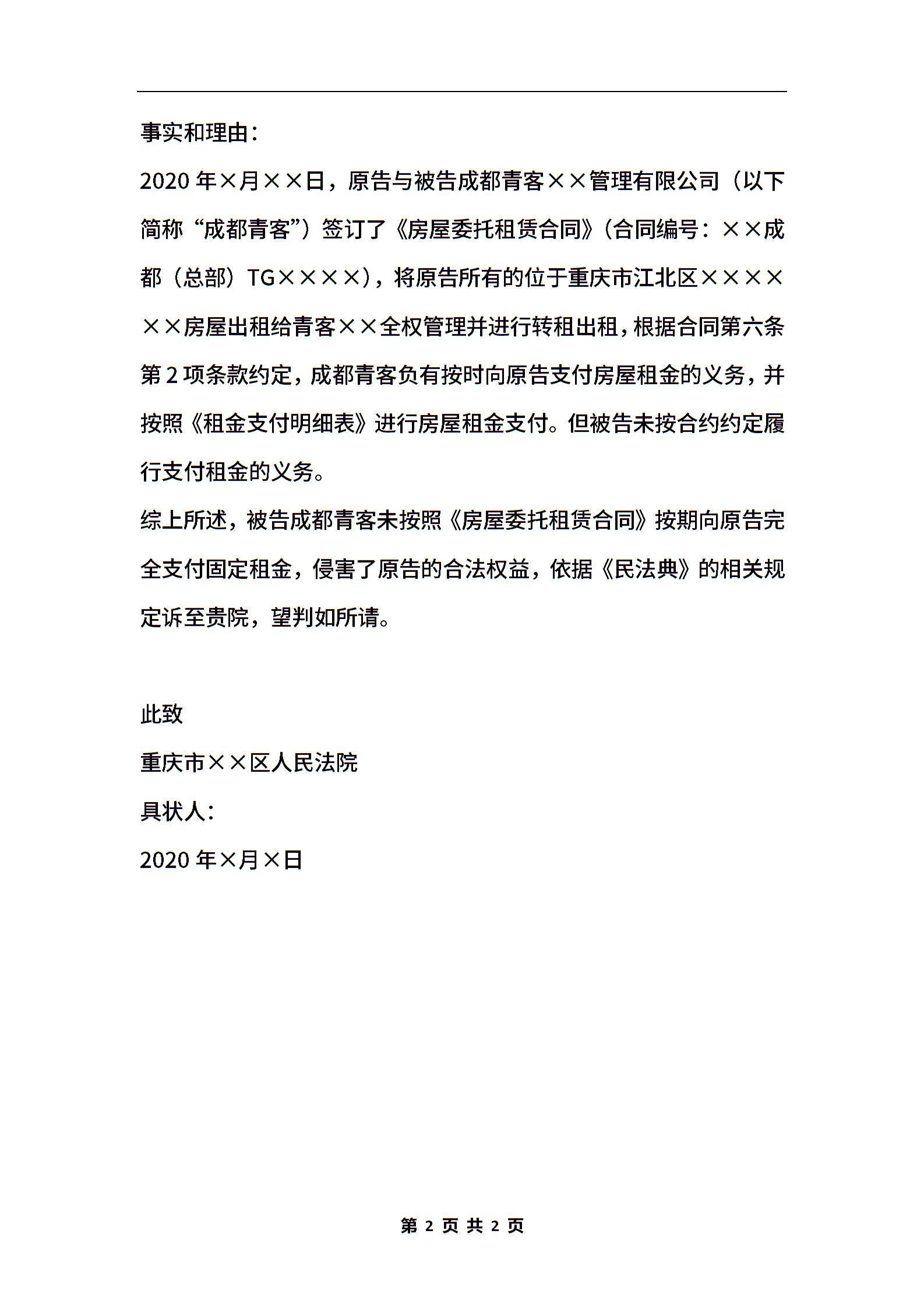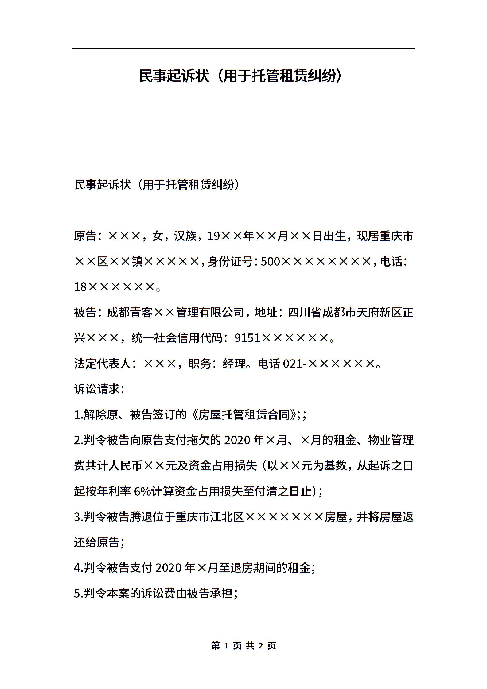 民事起诉状(用于托管租赁纠纷)