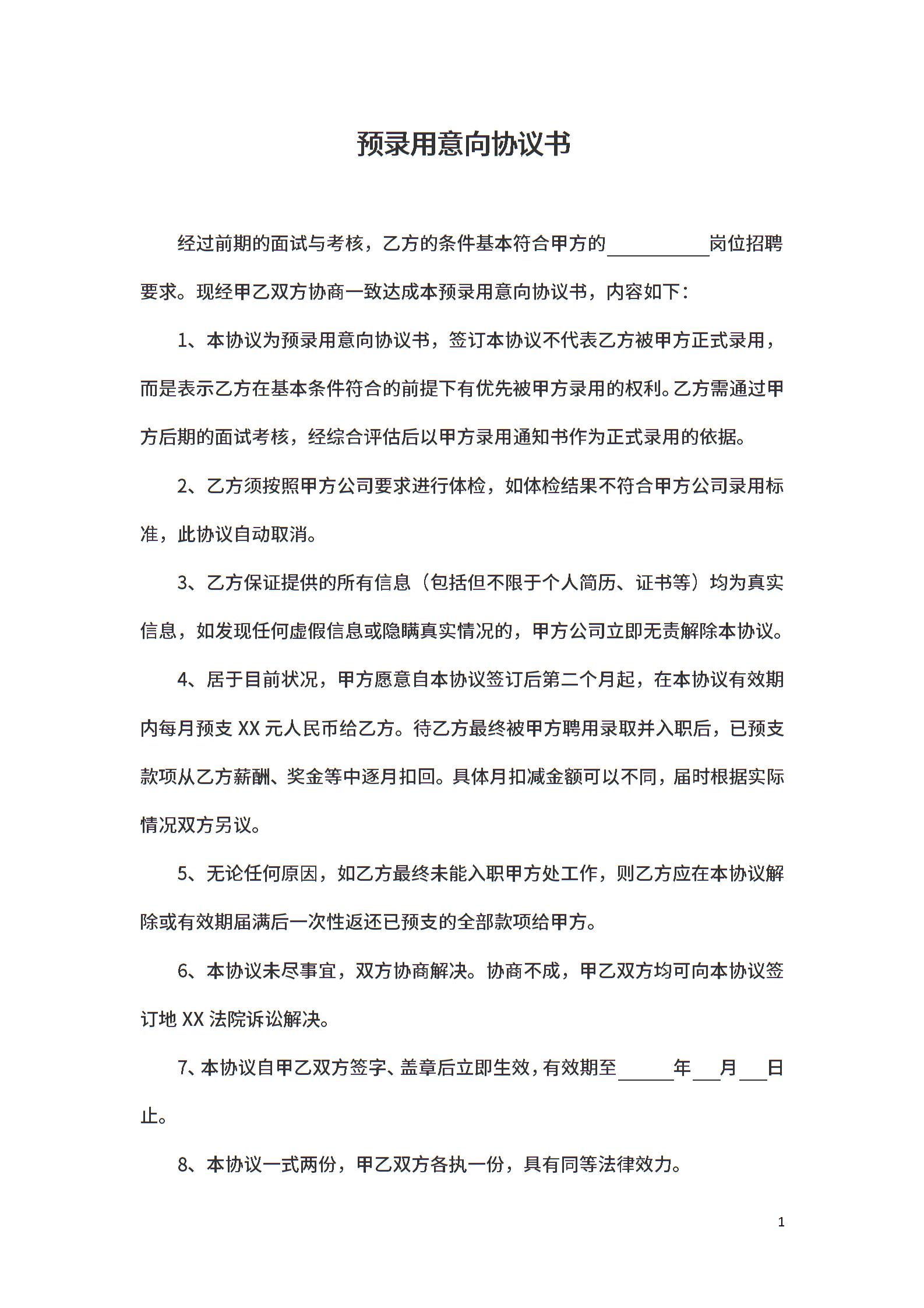 预录用意向协议书模板