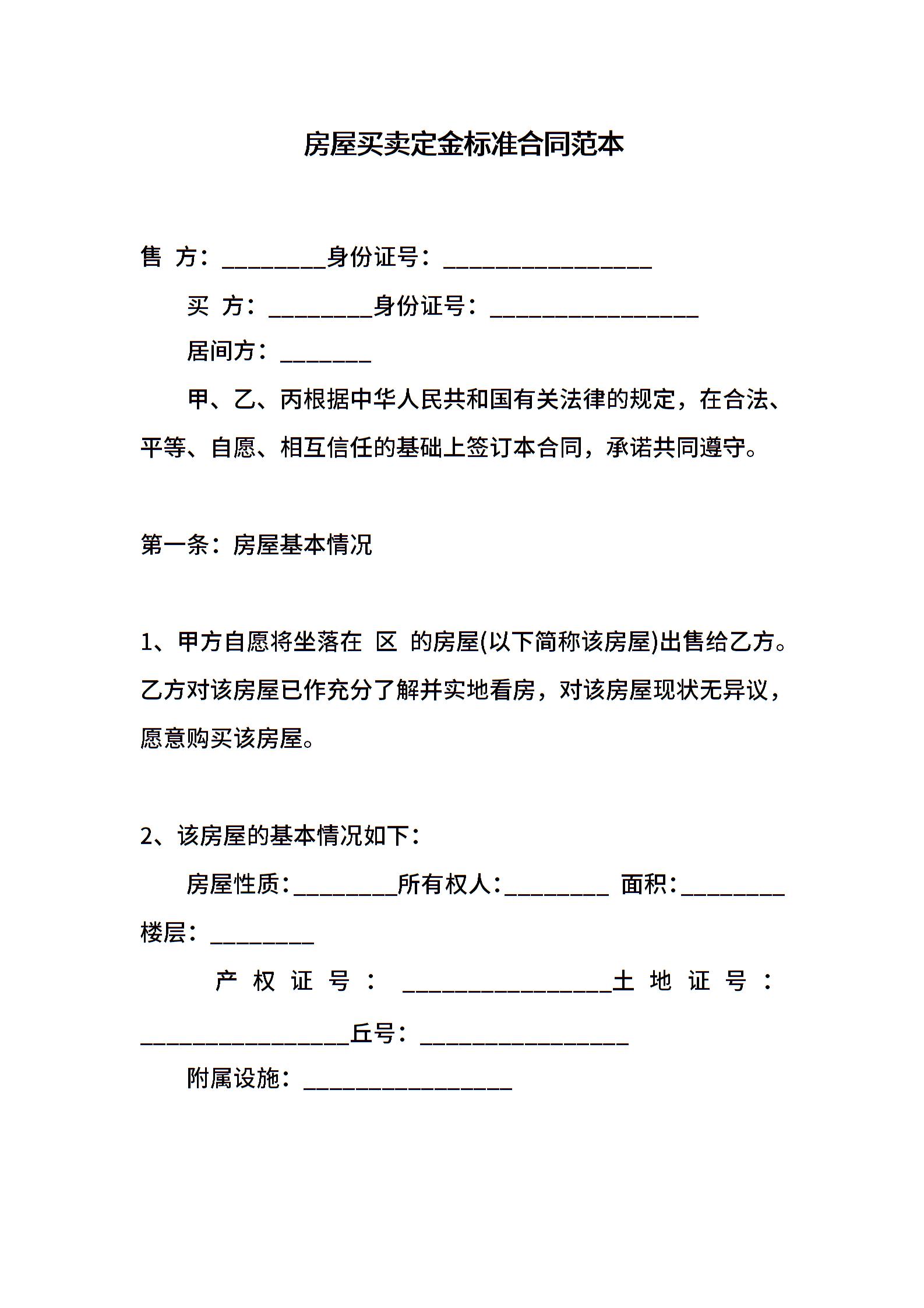 房屋买卖定金标准合同范本