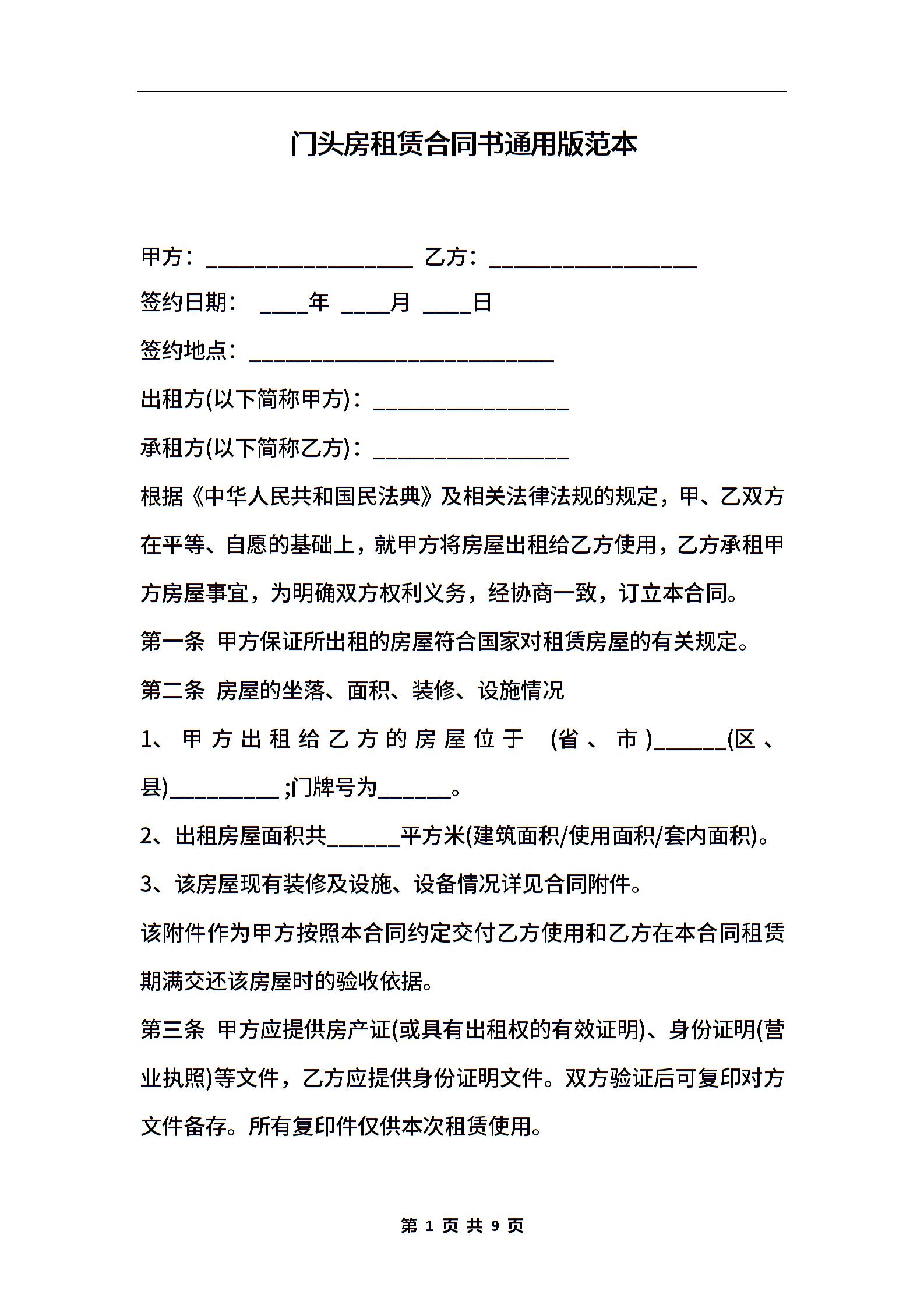 门头房租赁合同书通用版范本