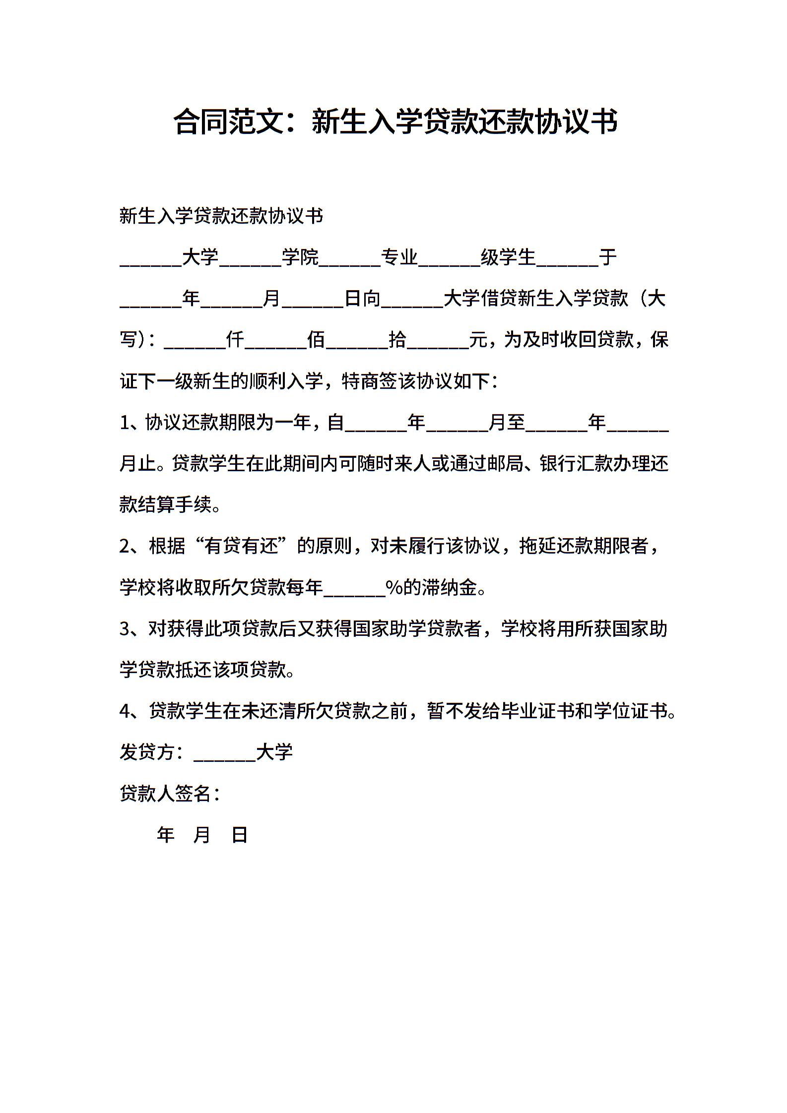 新生入学贷款还款协议书
