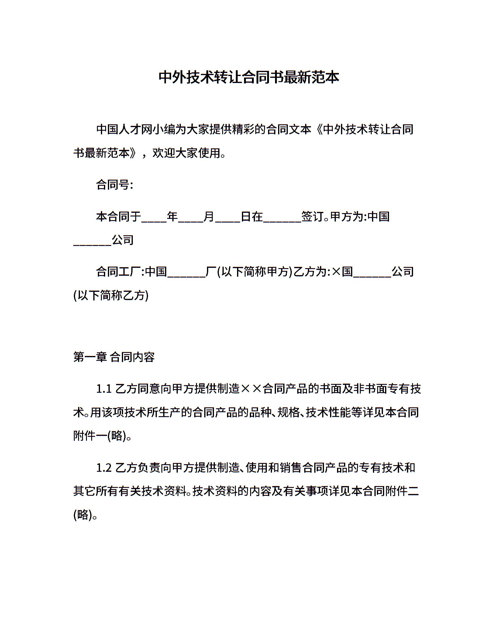 中外技术转让合同书最新范本