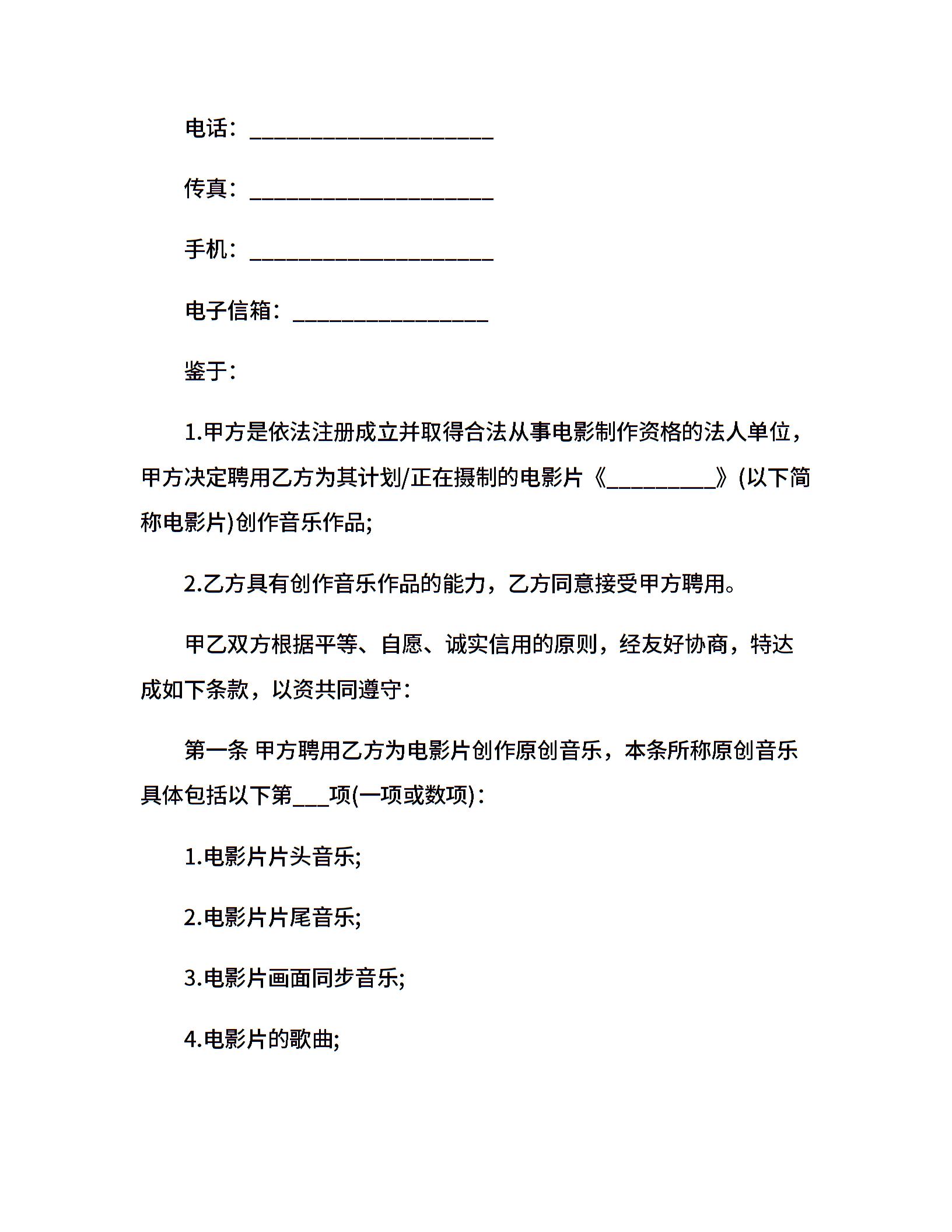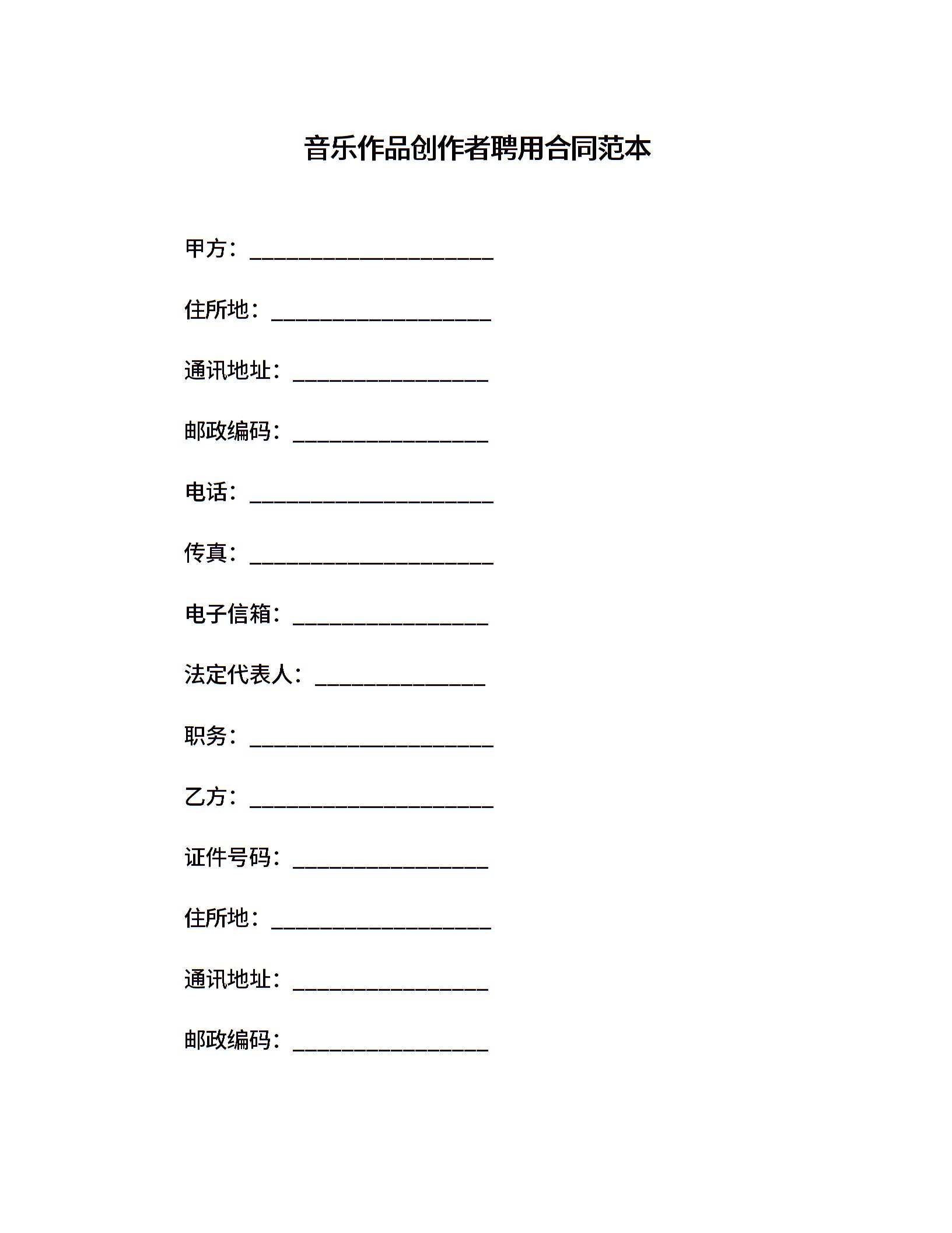 音乐作品创作者聘用合同范本