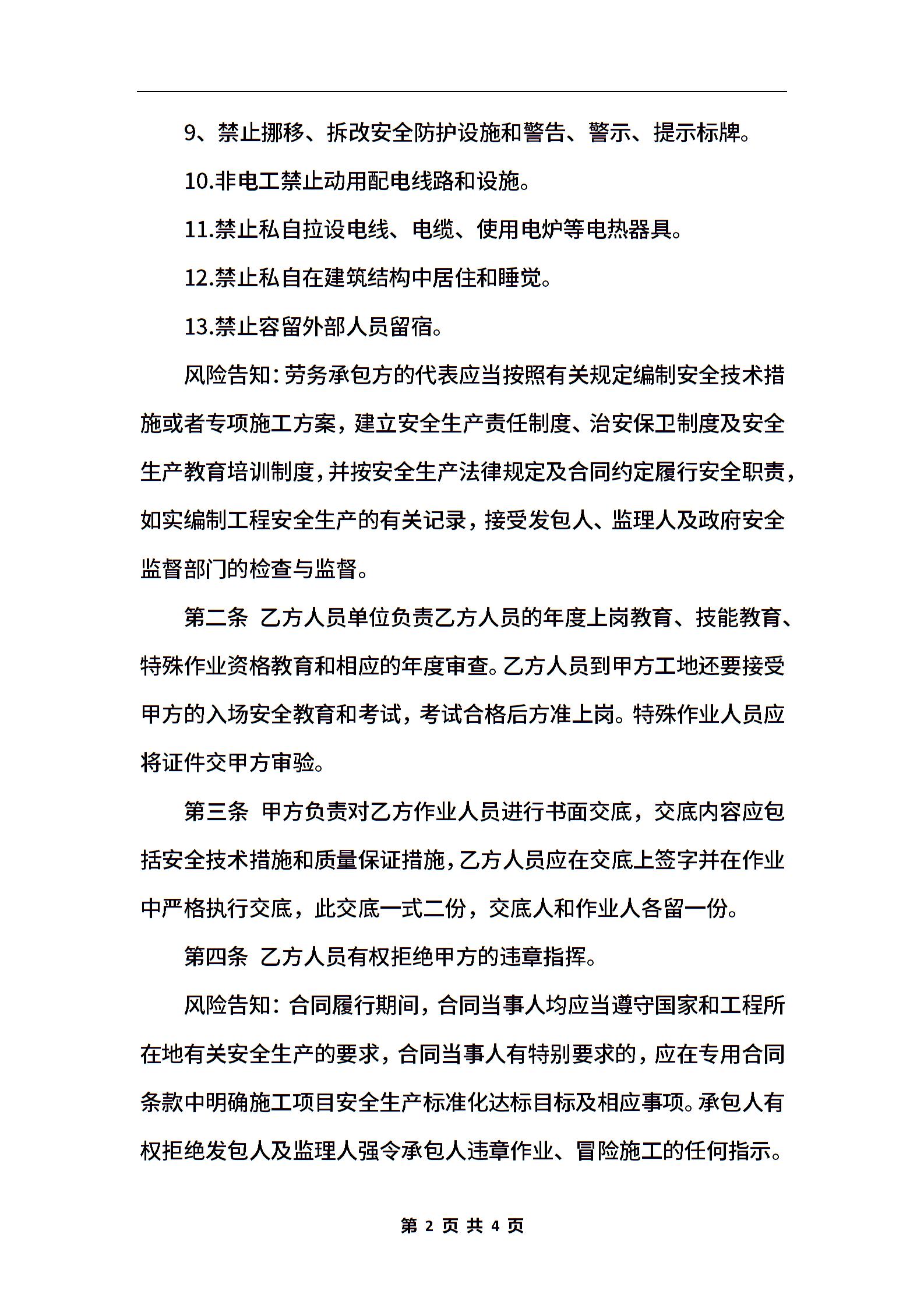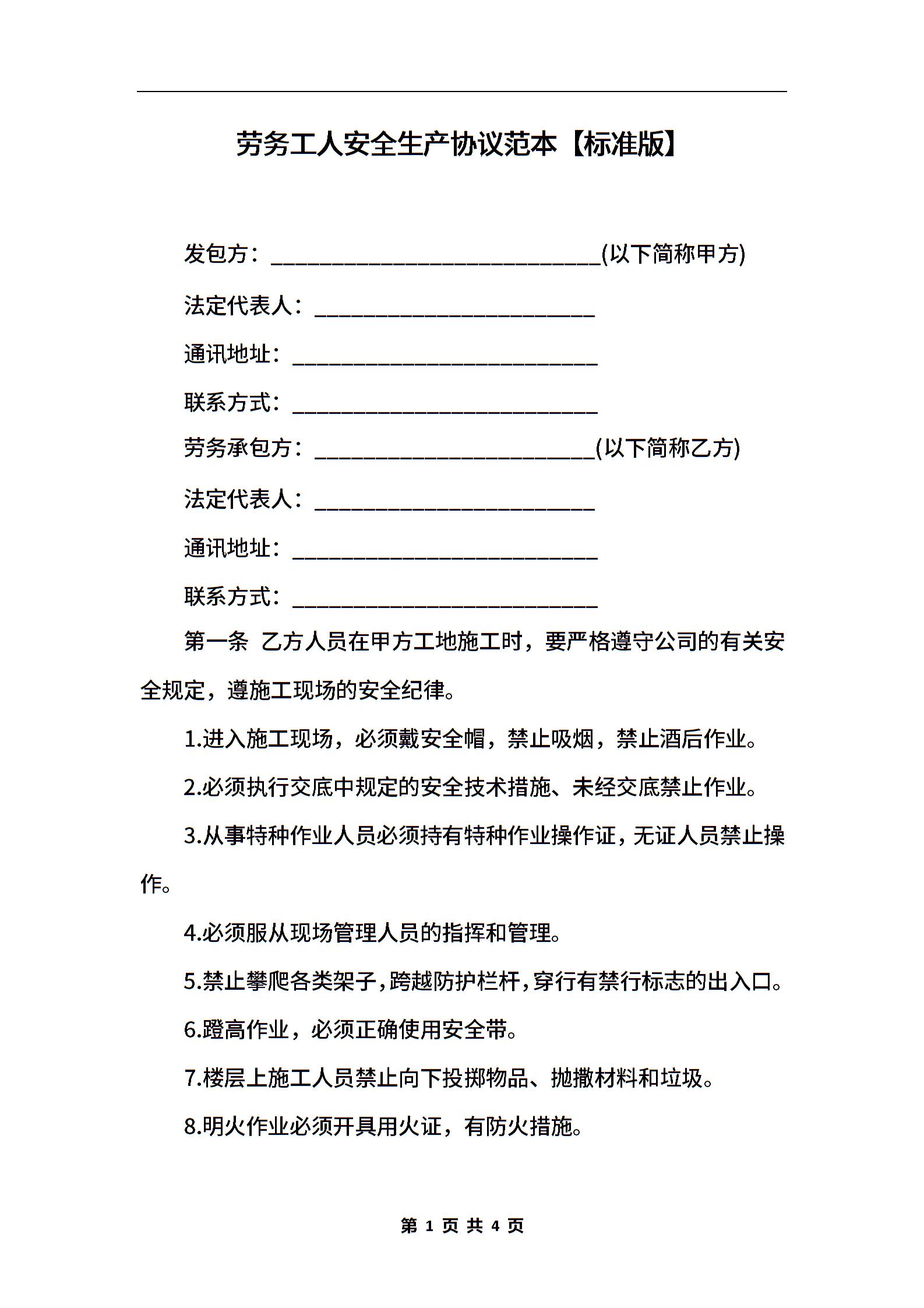 劳务工人安全生产协议范本【标准版】