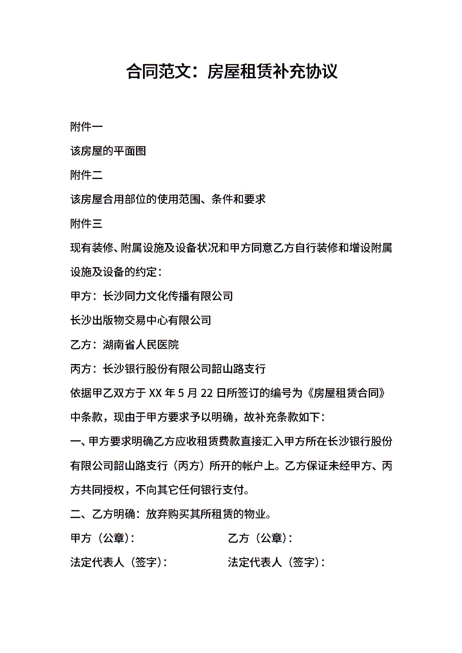 合同范文:房屋租赁补充协议