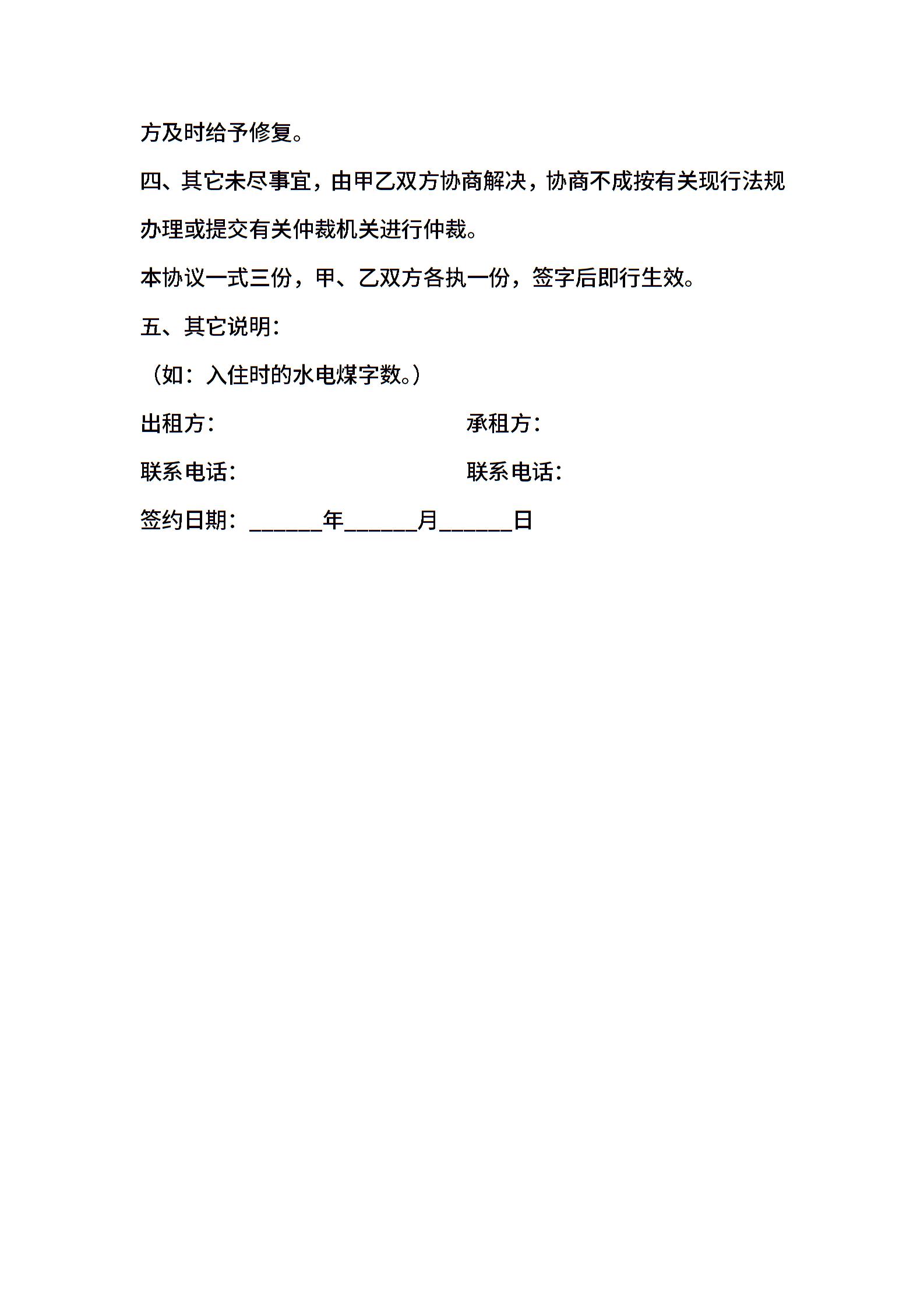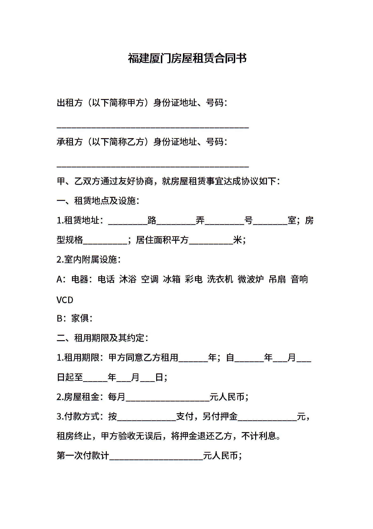 福建厦门房屋租赁合同书