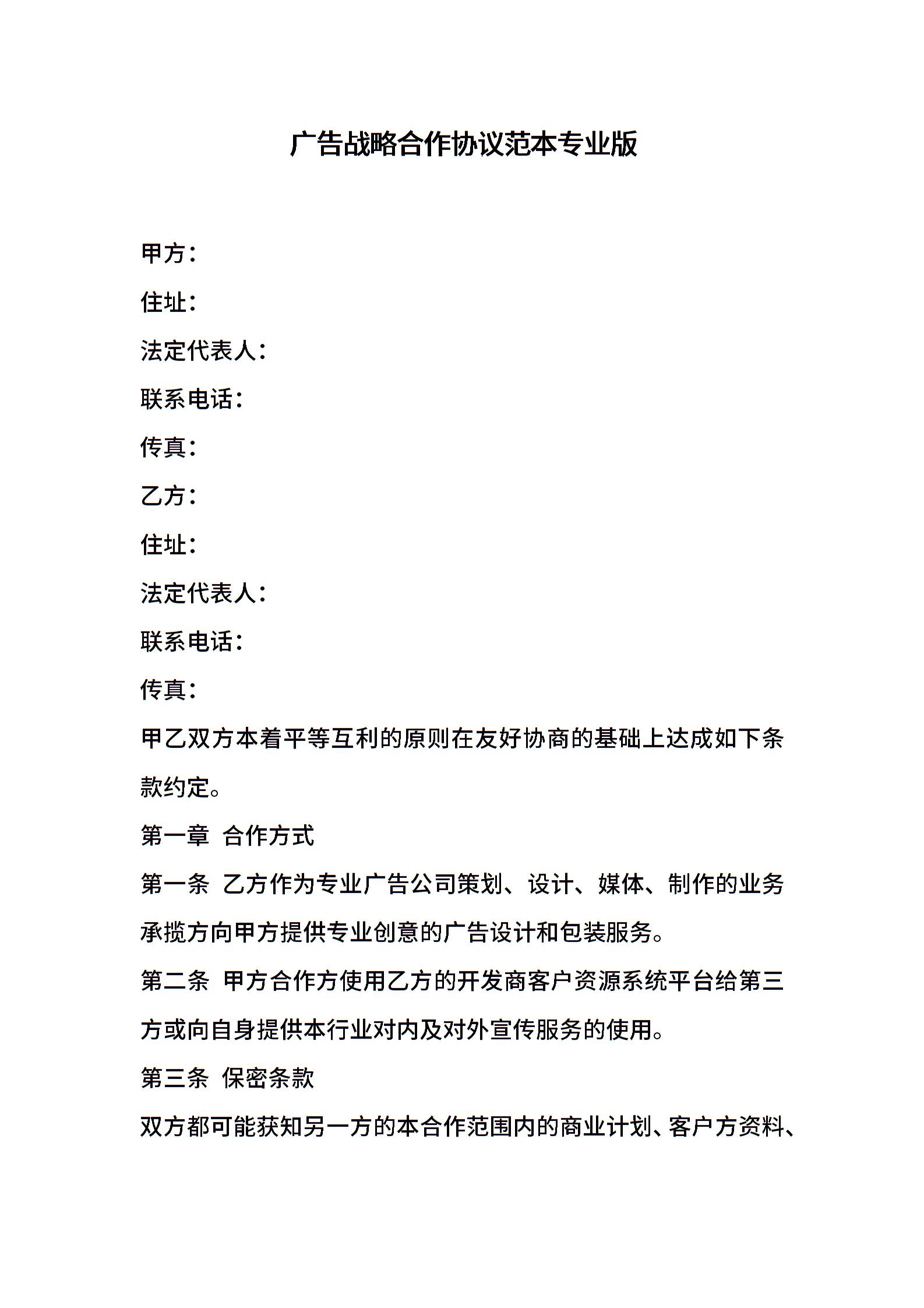 广告战略合作协议范本专业版