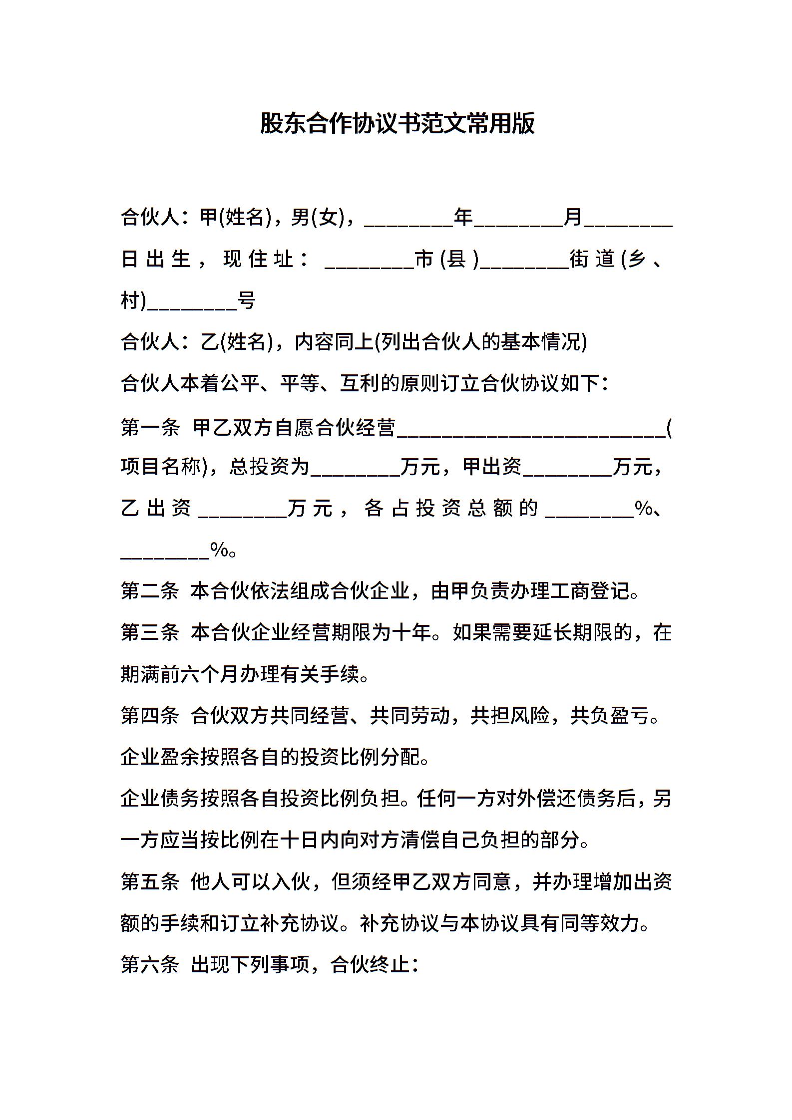股东合作协议书范文常用版