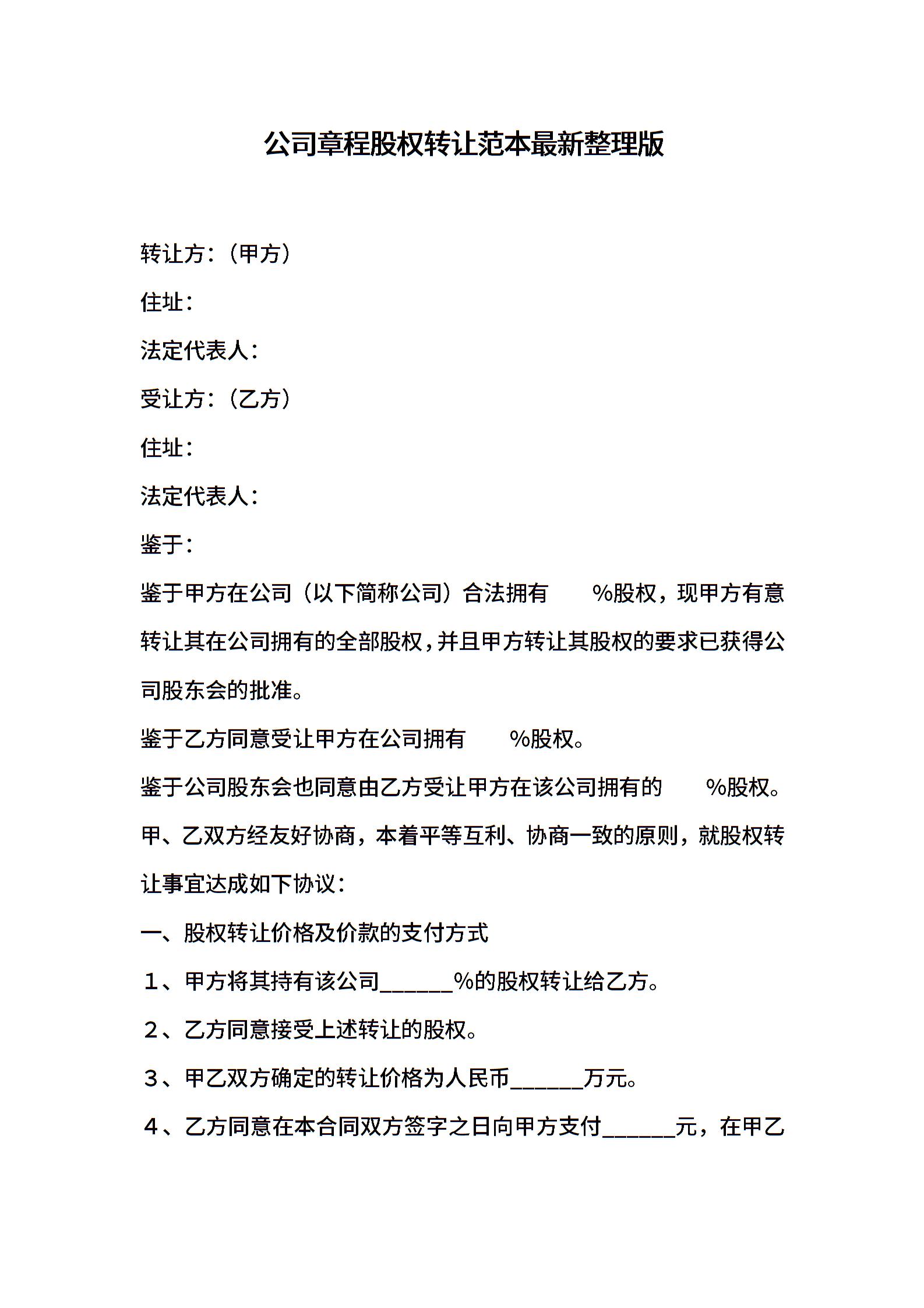公司章程股权转让范本最新整理版