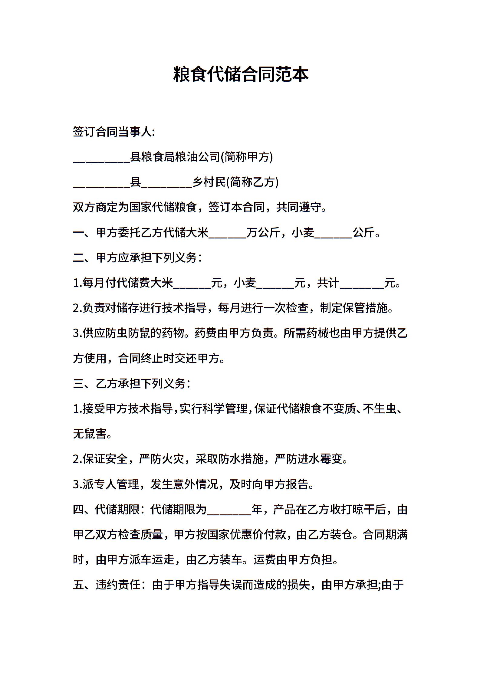 粮食代储合同范本
