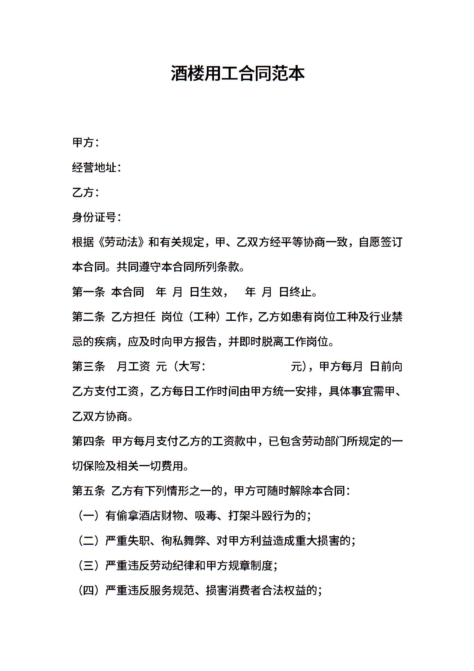 酒楼用工合同范本