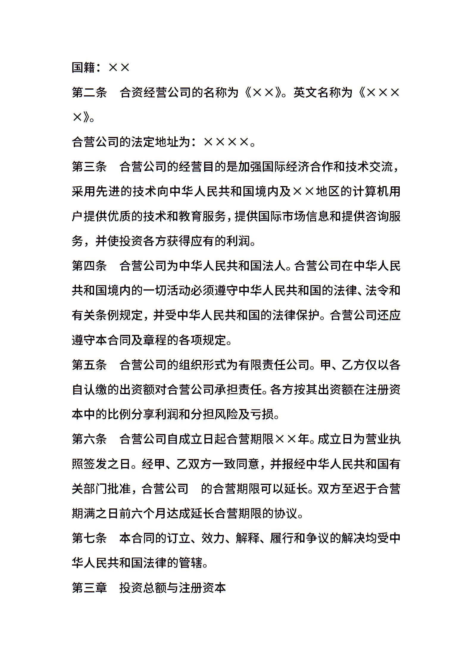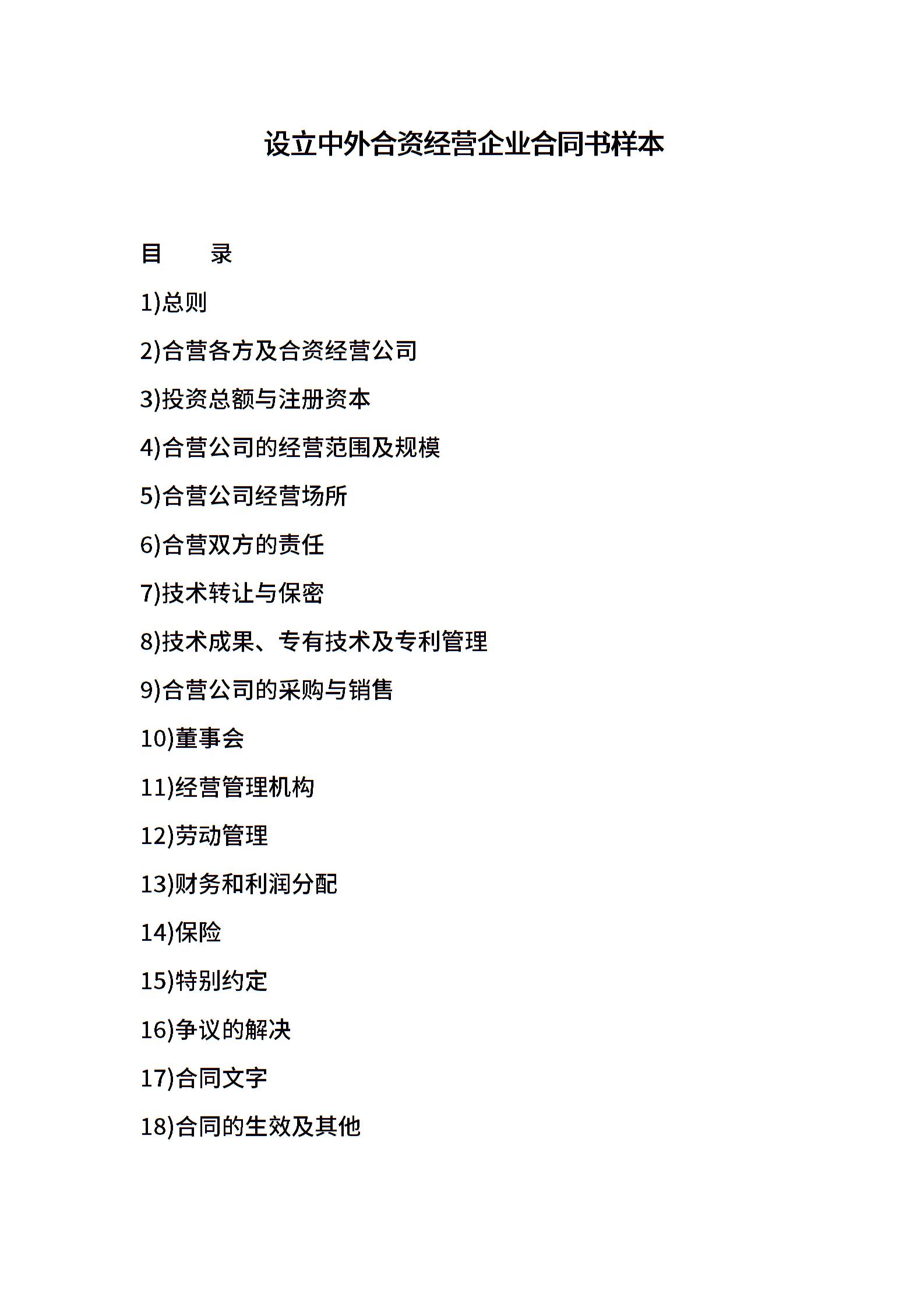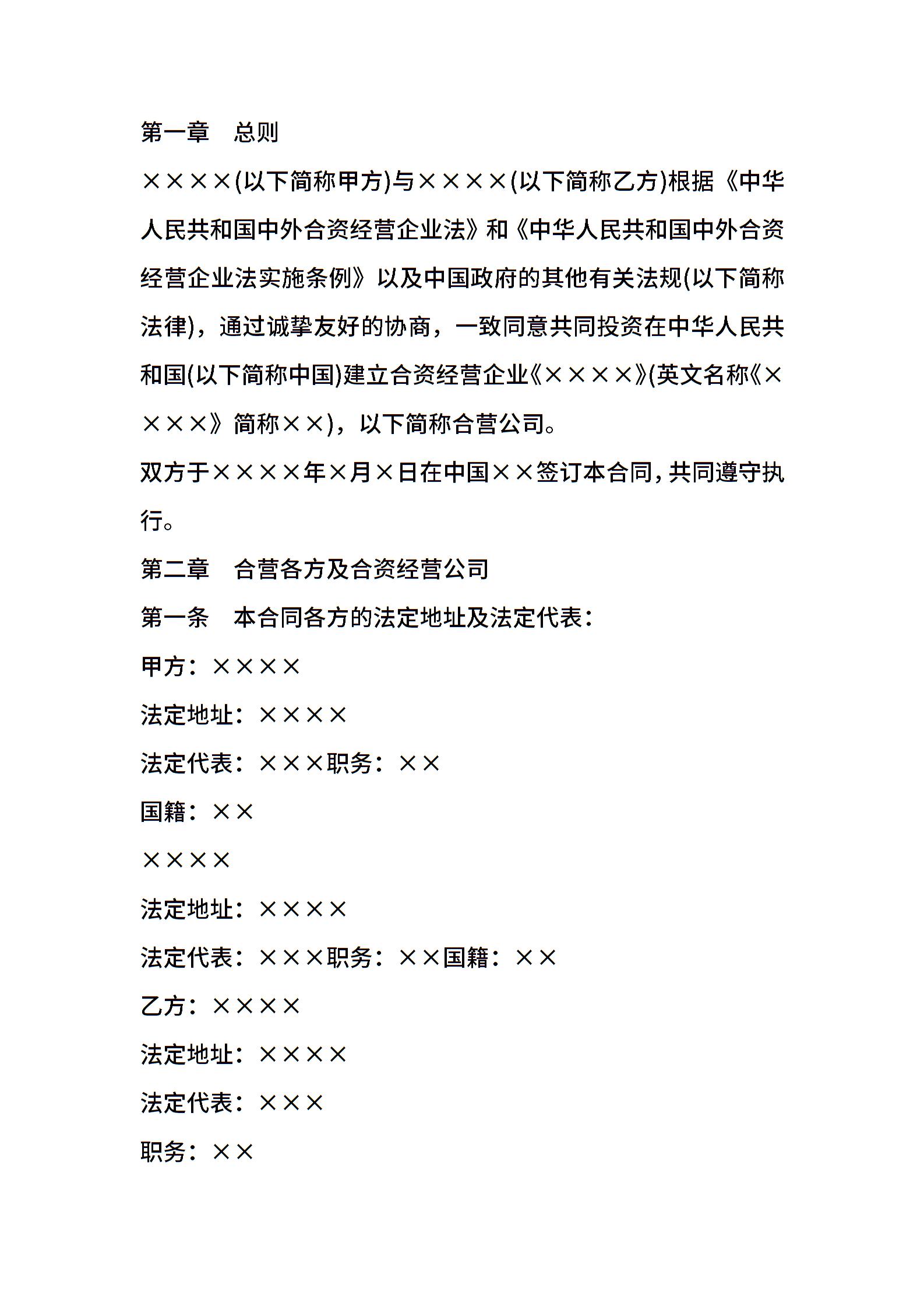 设立中外合资经营企业合同书样本