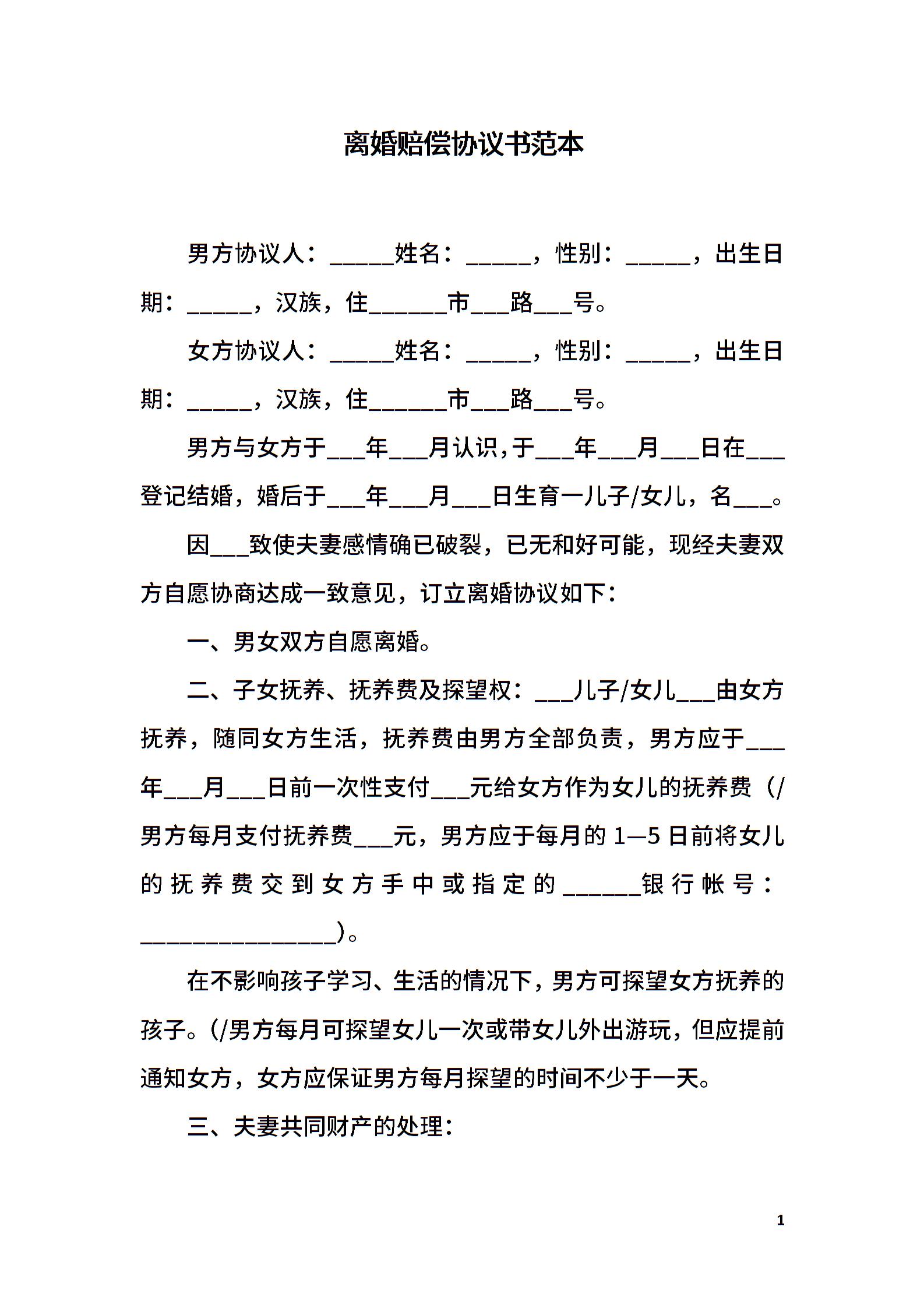 离婚赔偿协议书范本