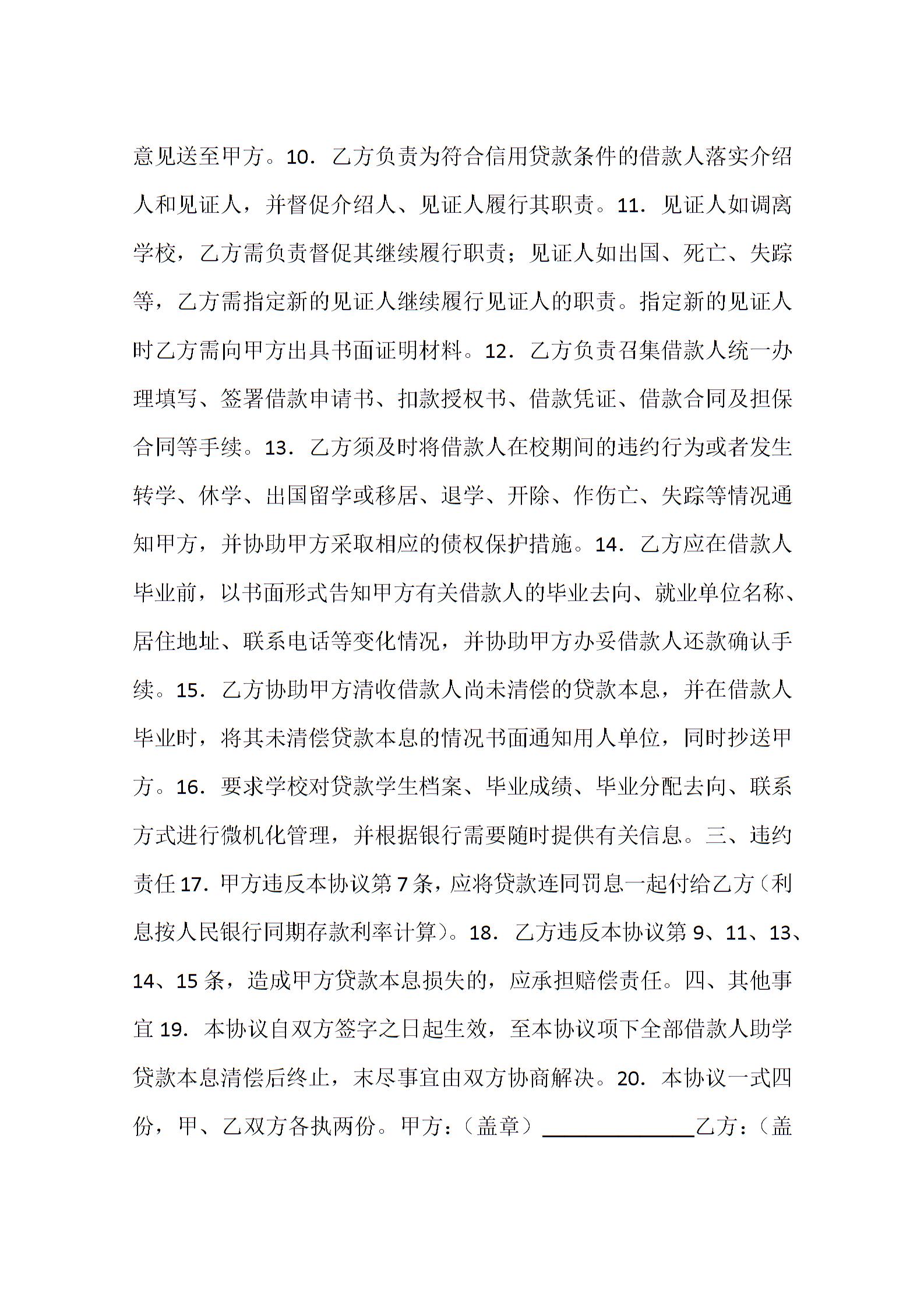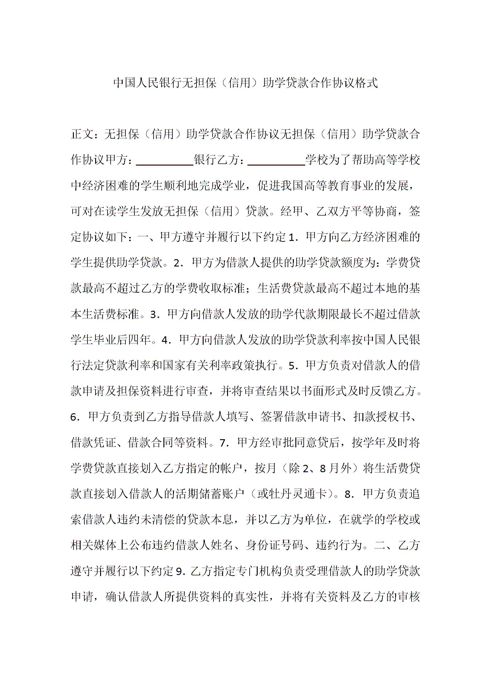 中国人民银行无担保(信用)助学贷款合作协议格式.doc