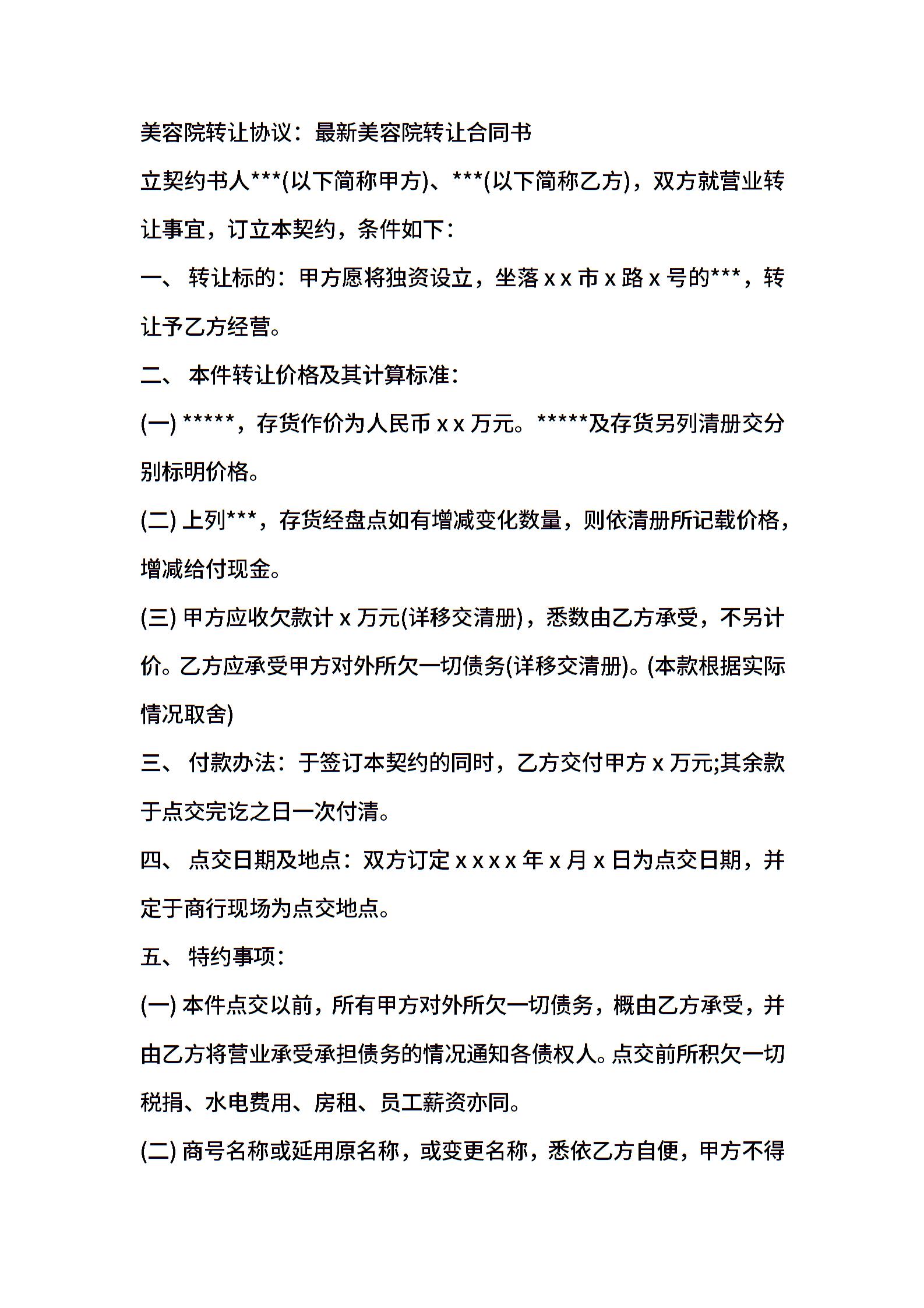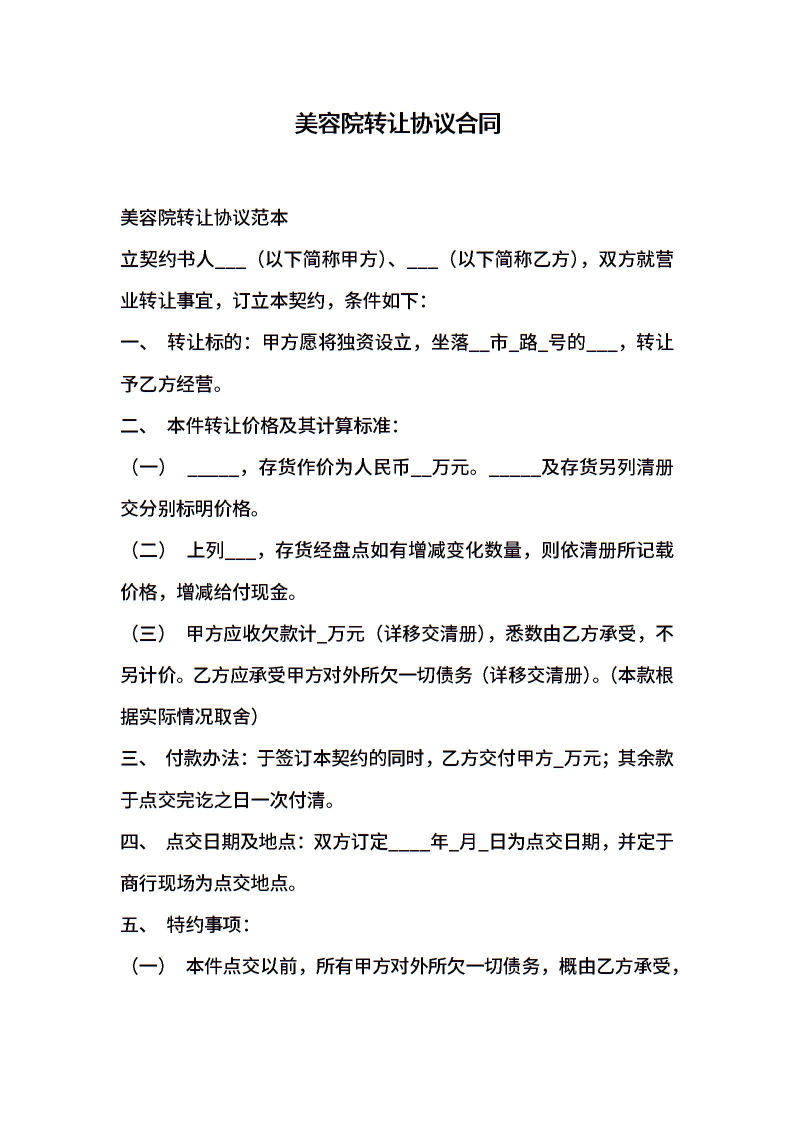 美容院转让协议合同