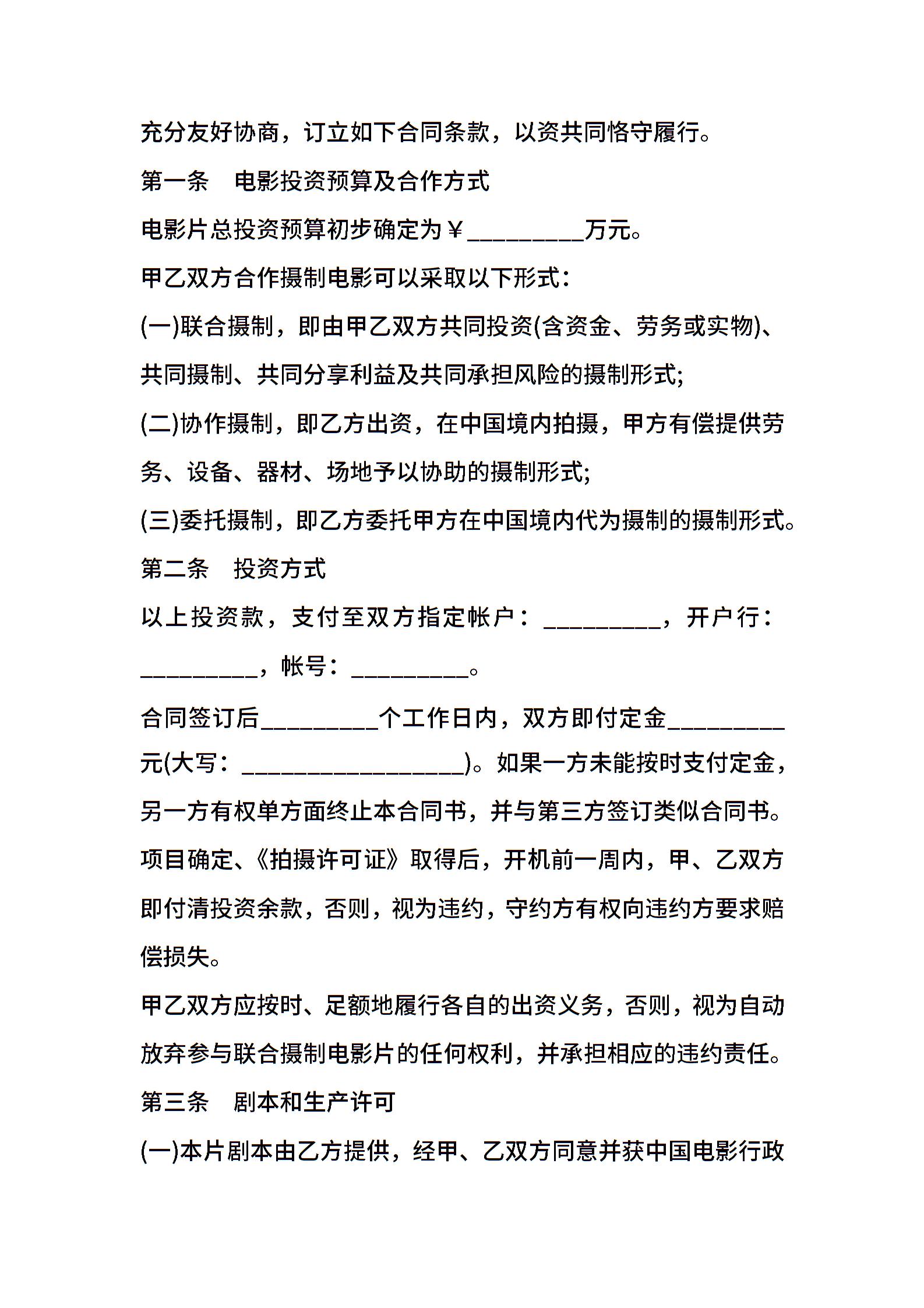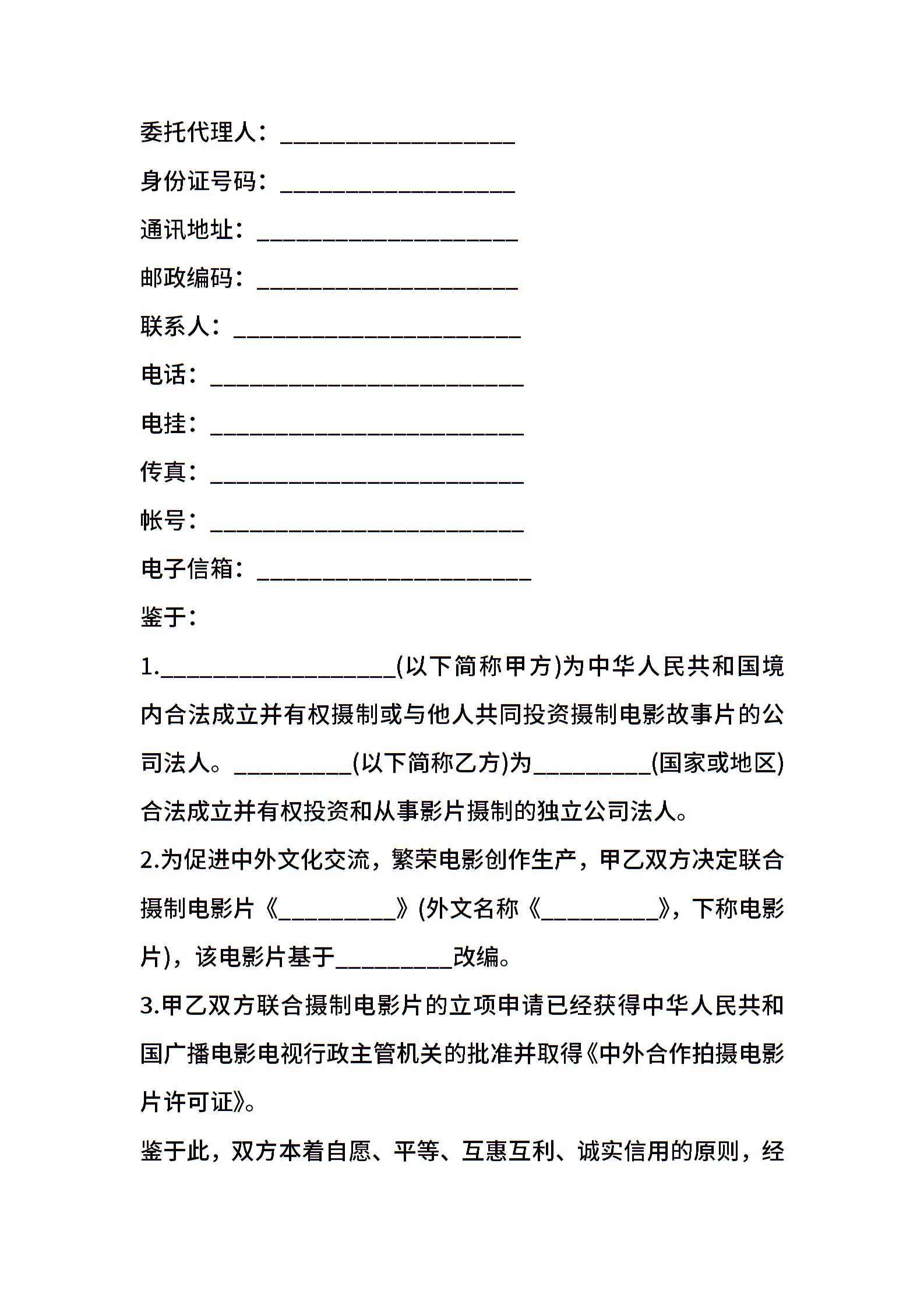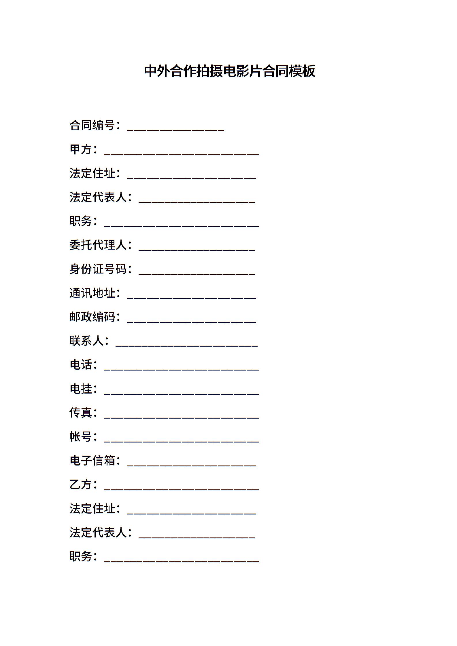 中外合作拍摄电影片合同模板