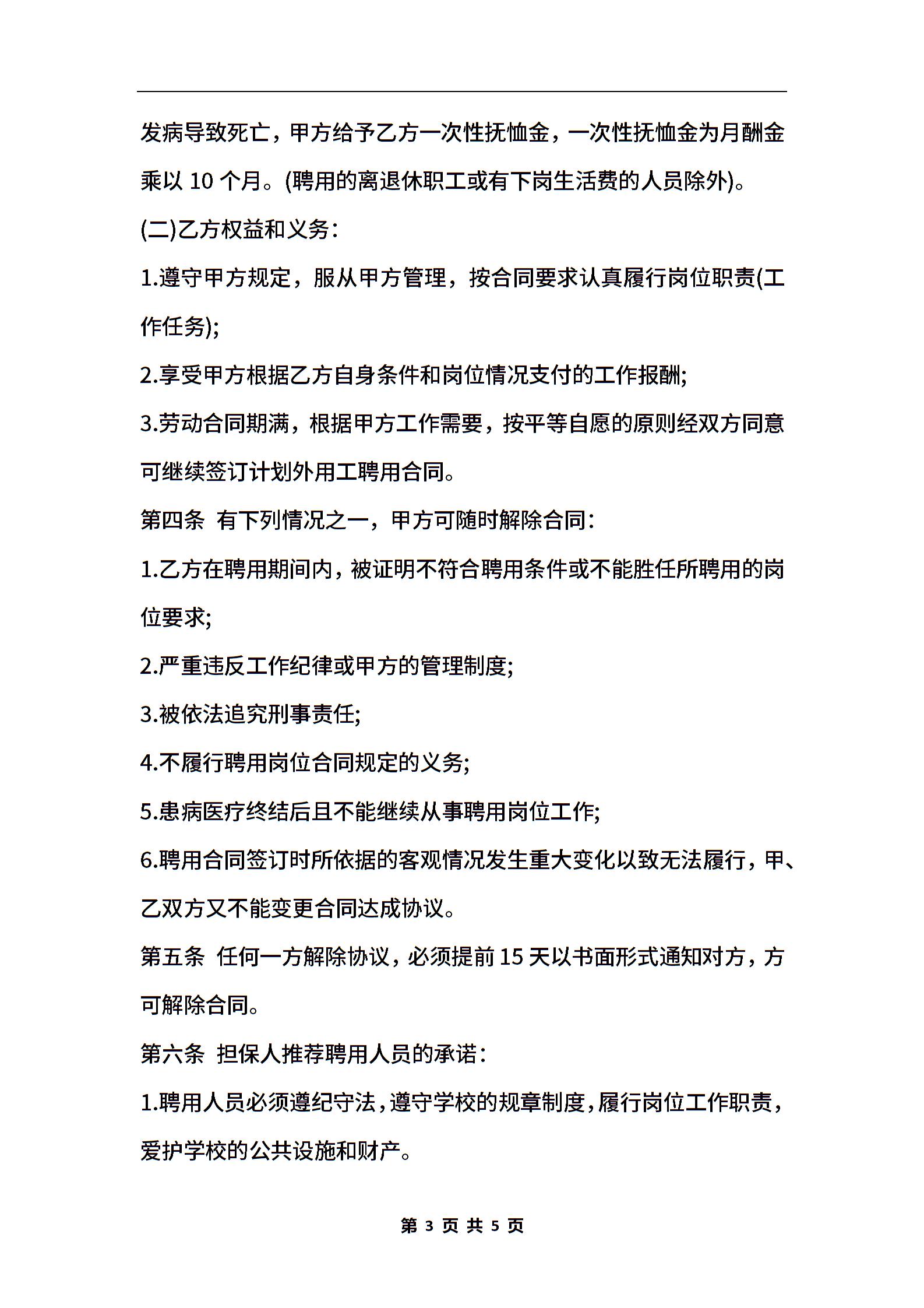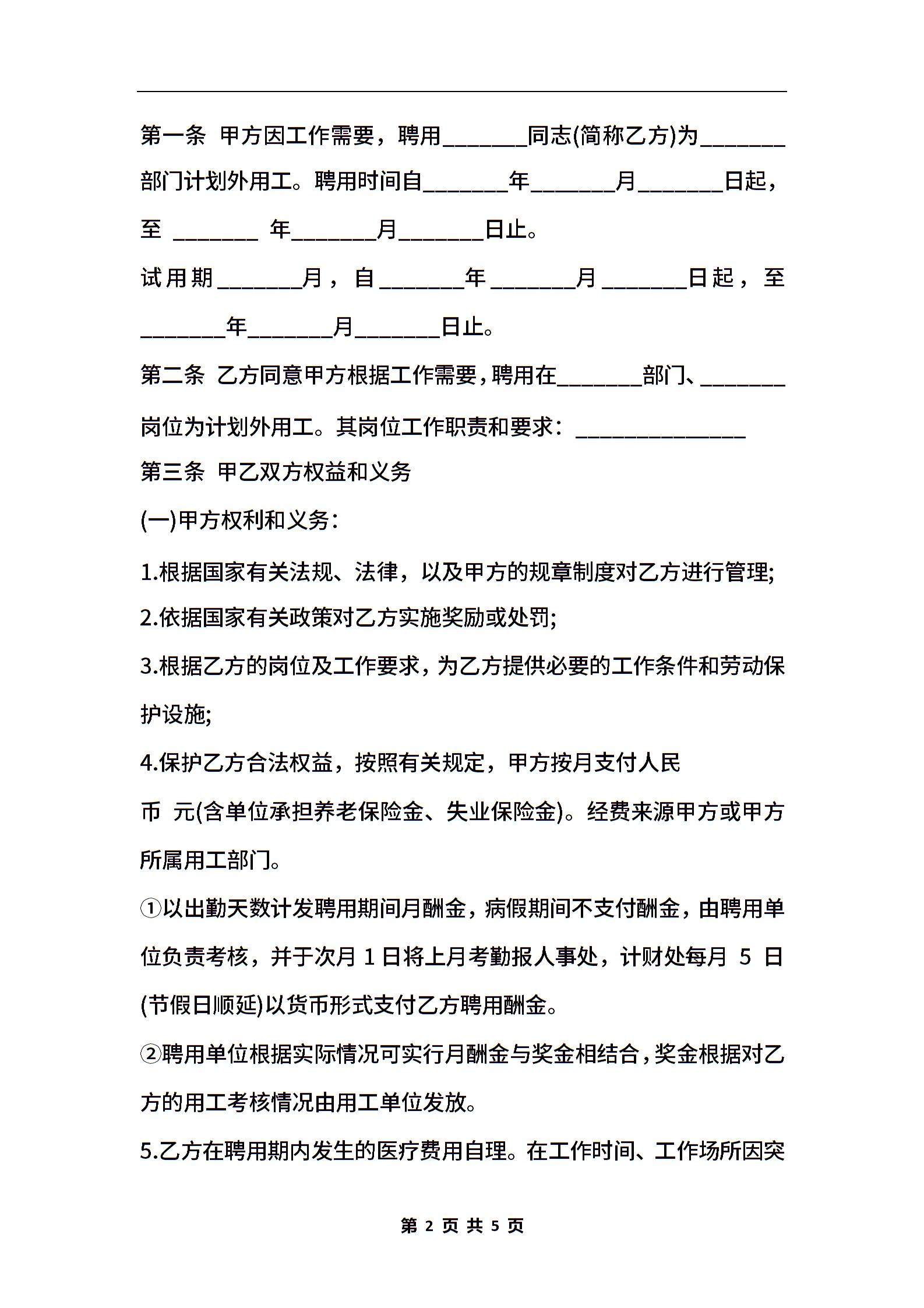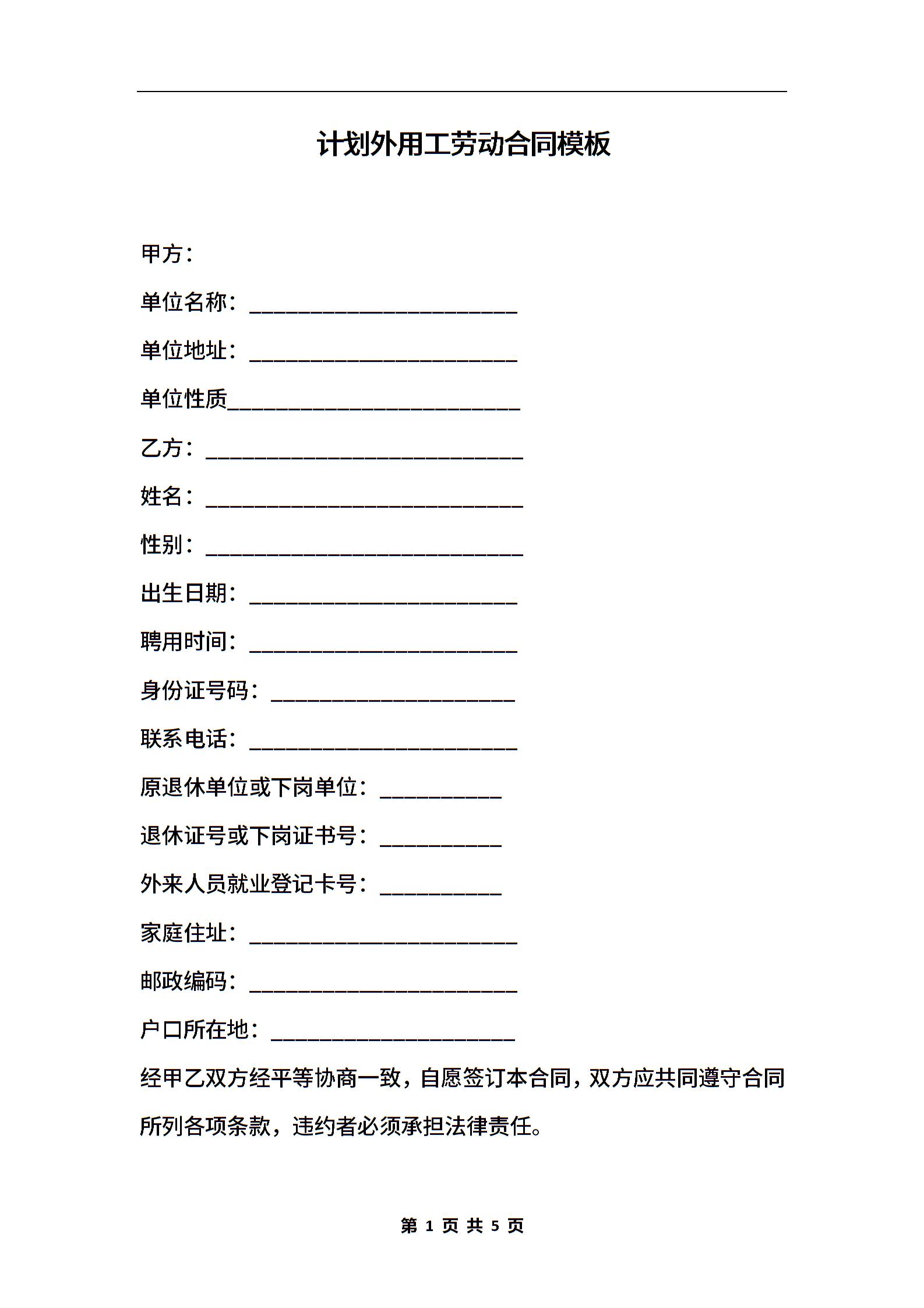 计划外用工劳动合同模板
