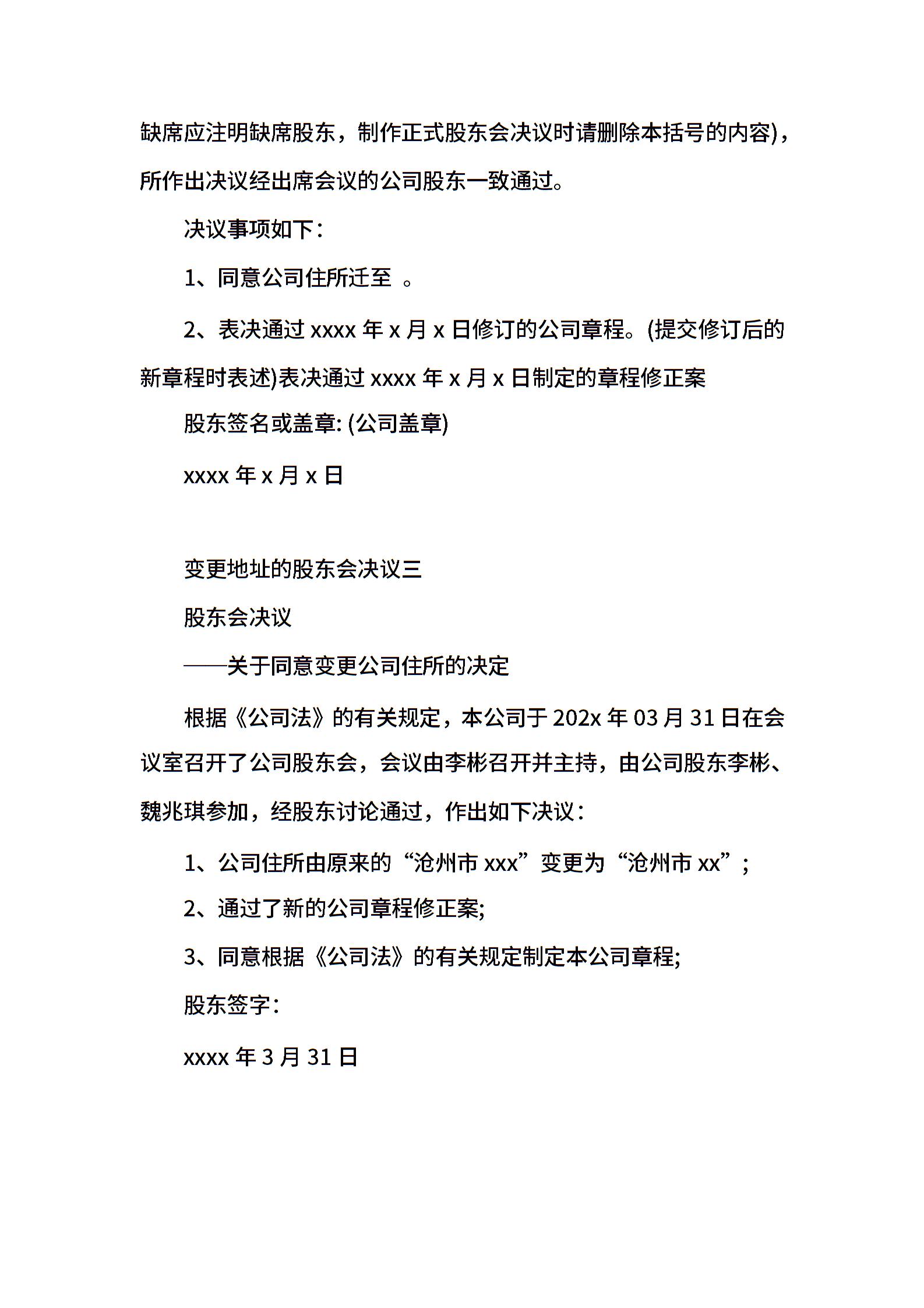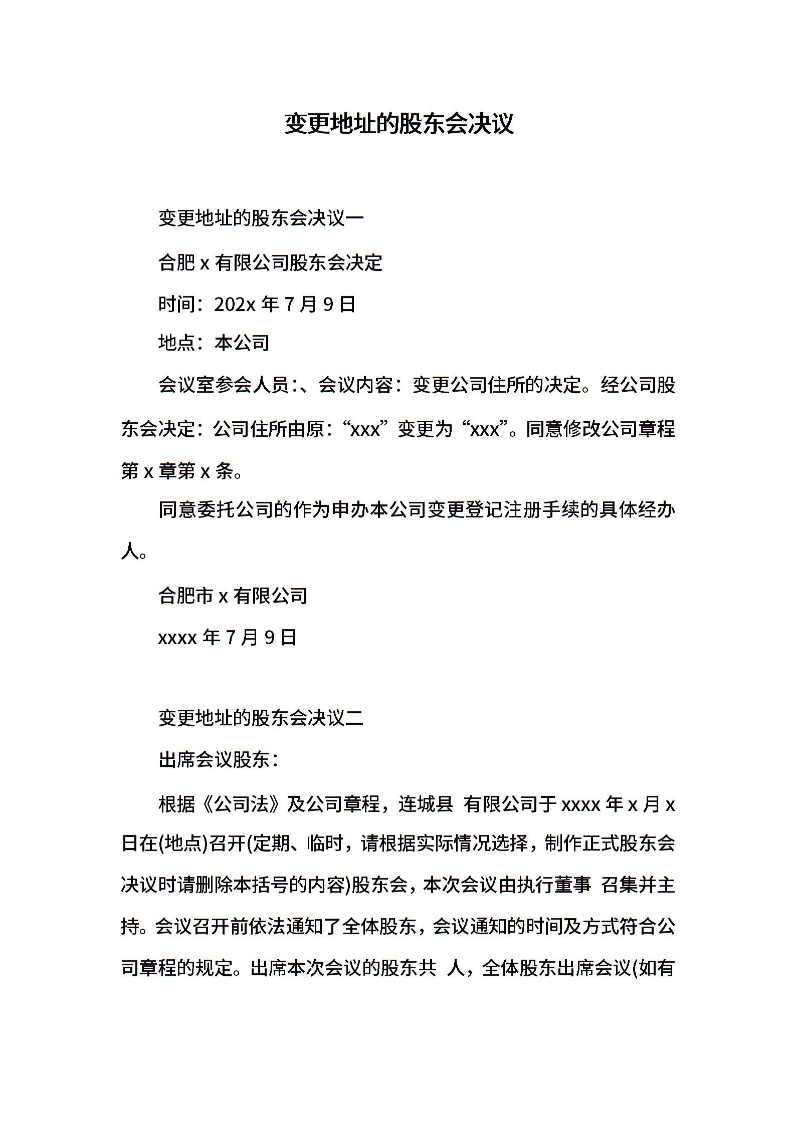 变更地址的股东会决议