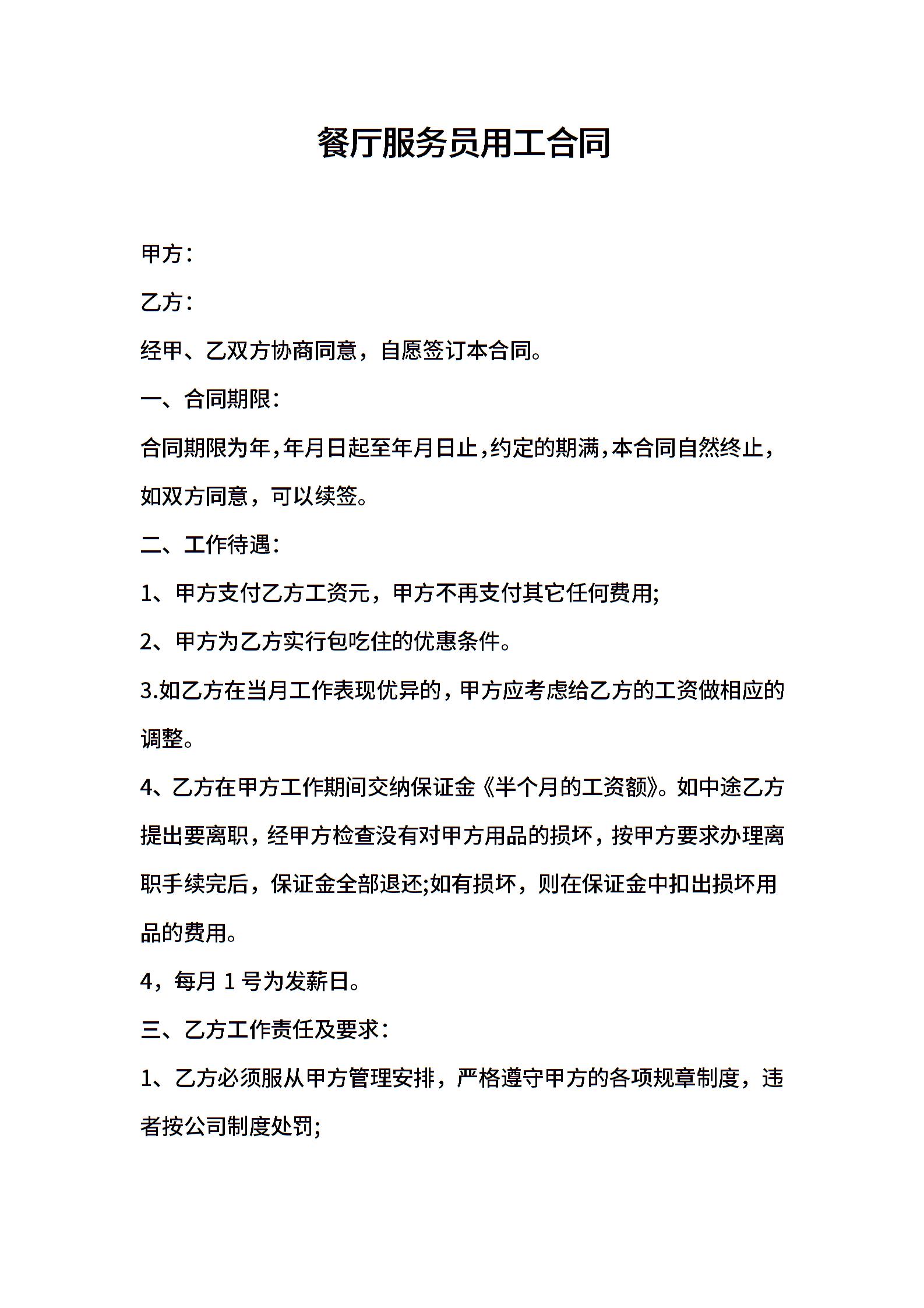 2021年餐厅服务员用工合同