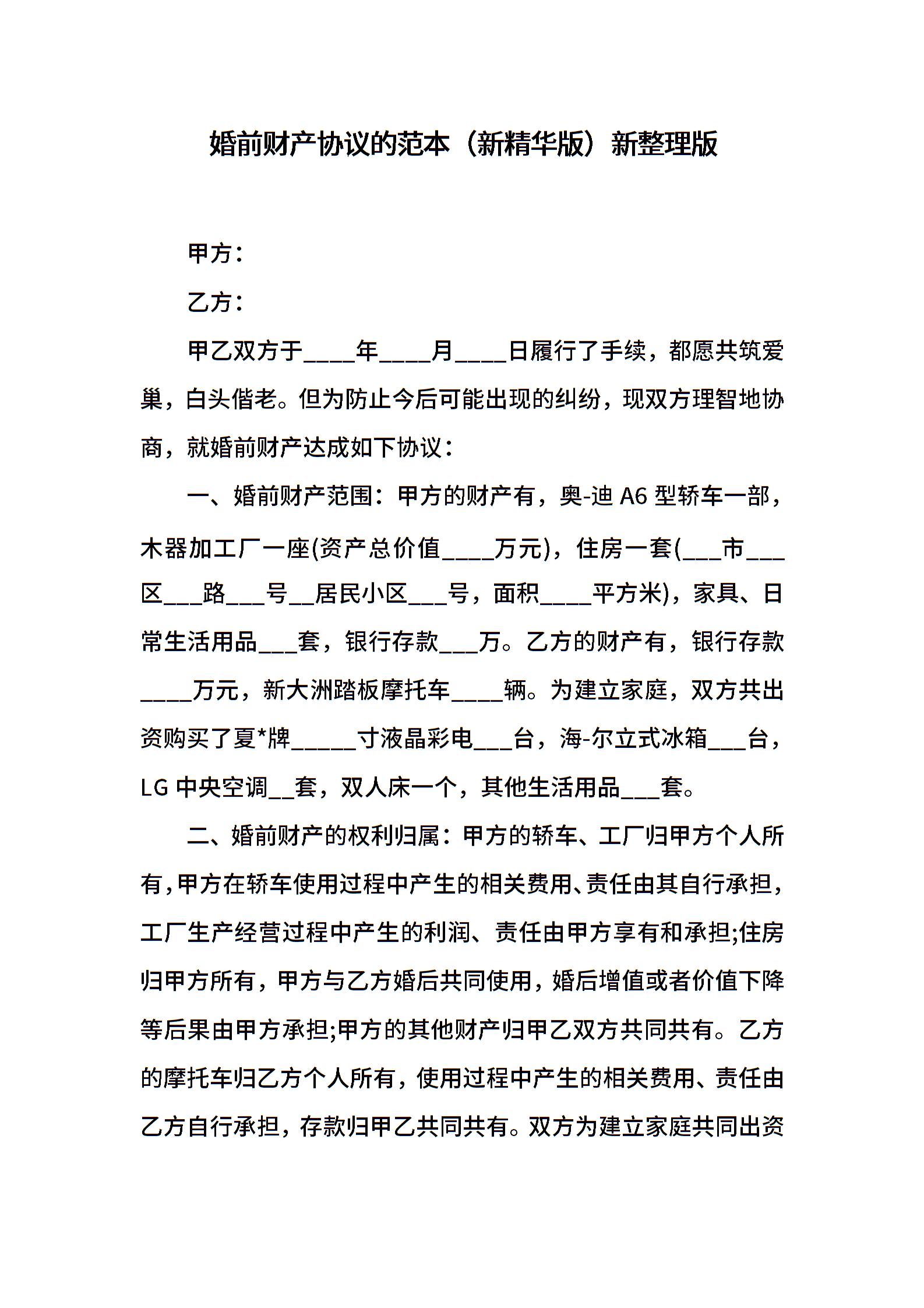 婚前财产协议的范本(新精华版)新整理版