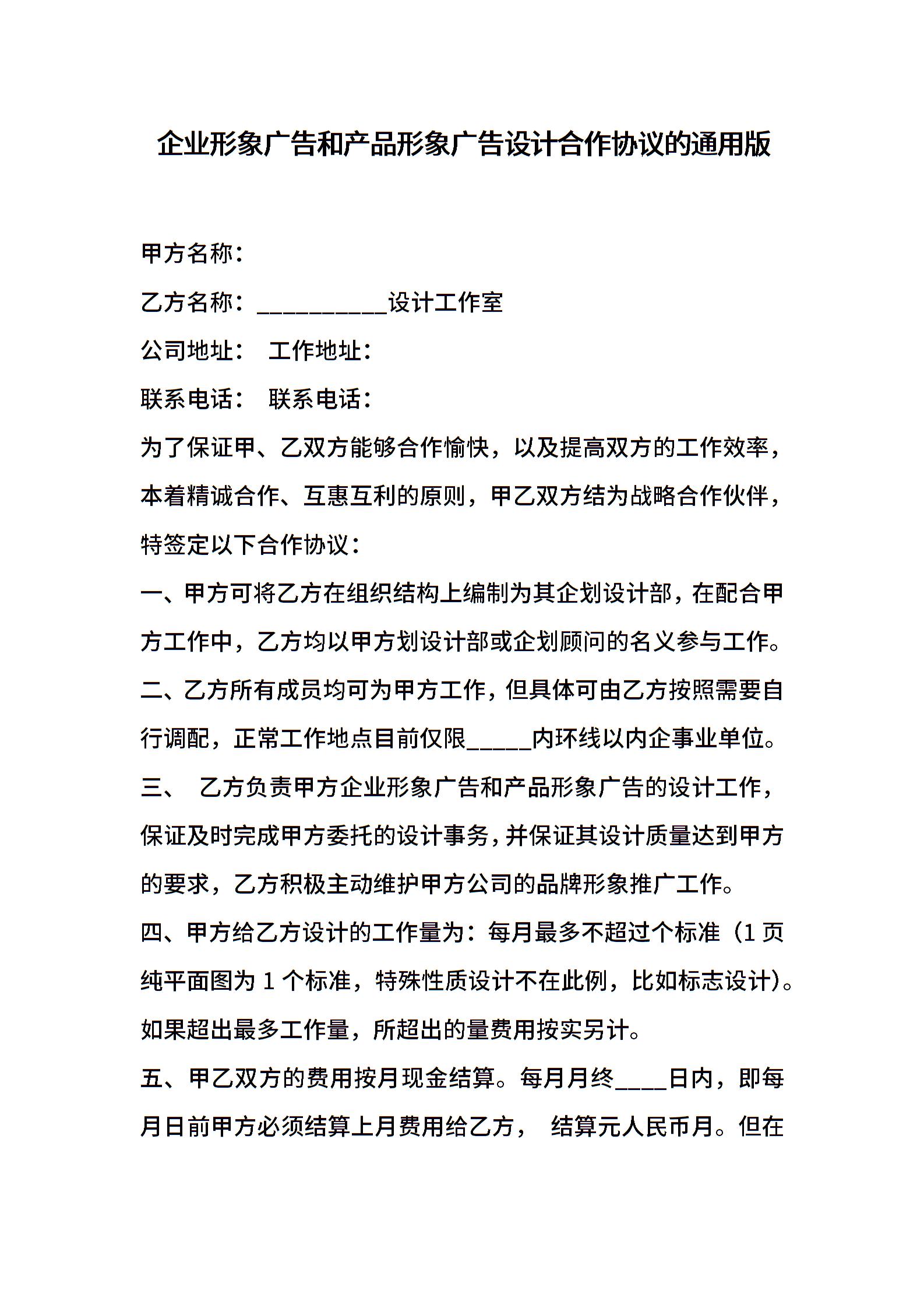 企业形象广告和产品形象广告设计合作协议的通用版