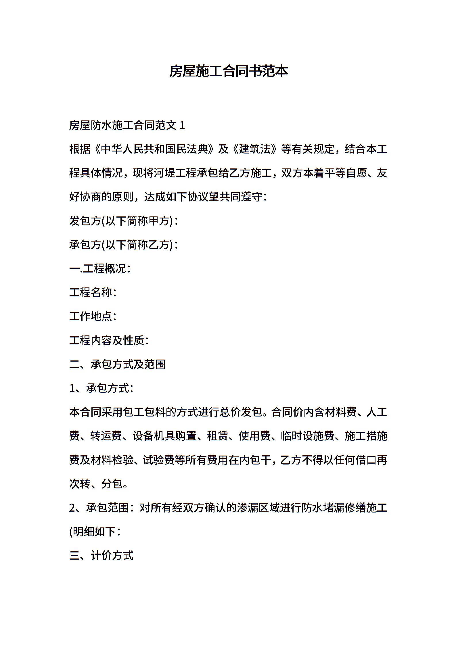 房屋施工合同书范本