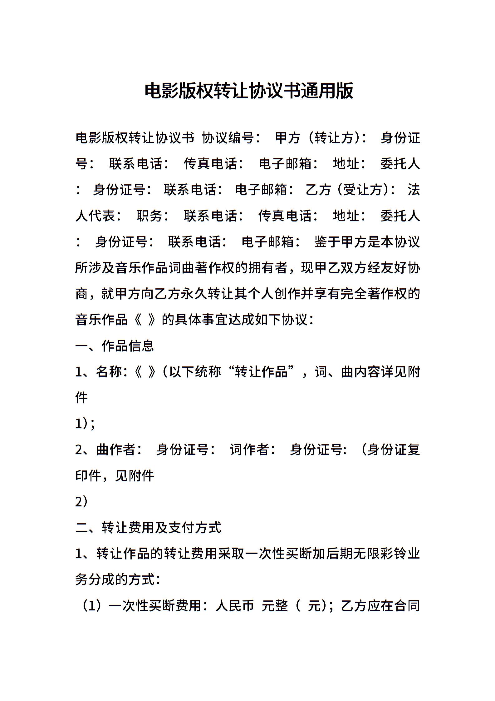 电影版权转让协议书通用版