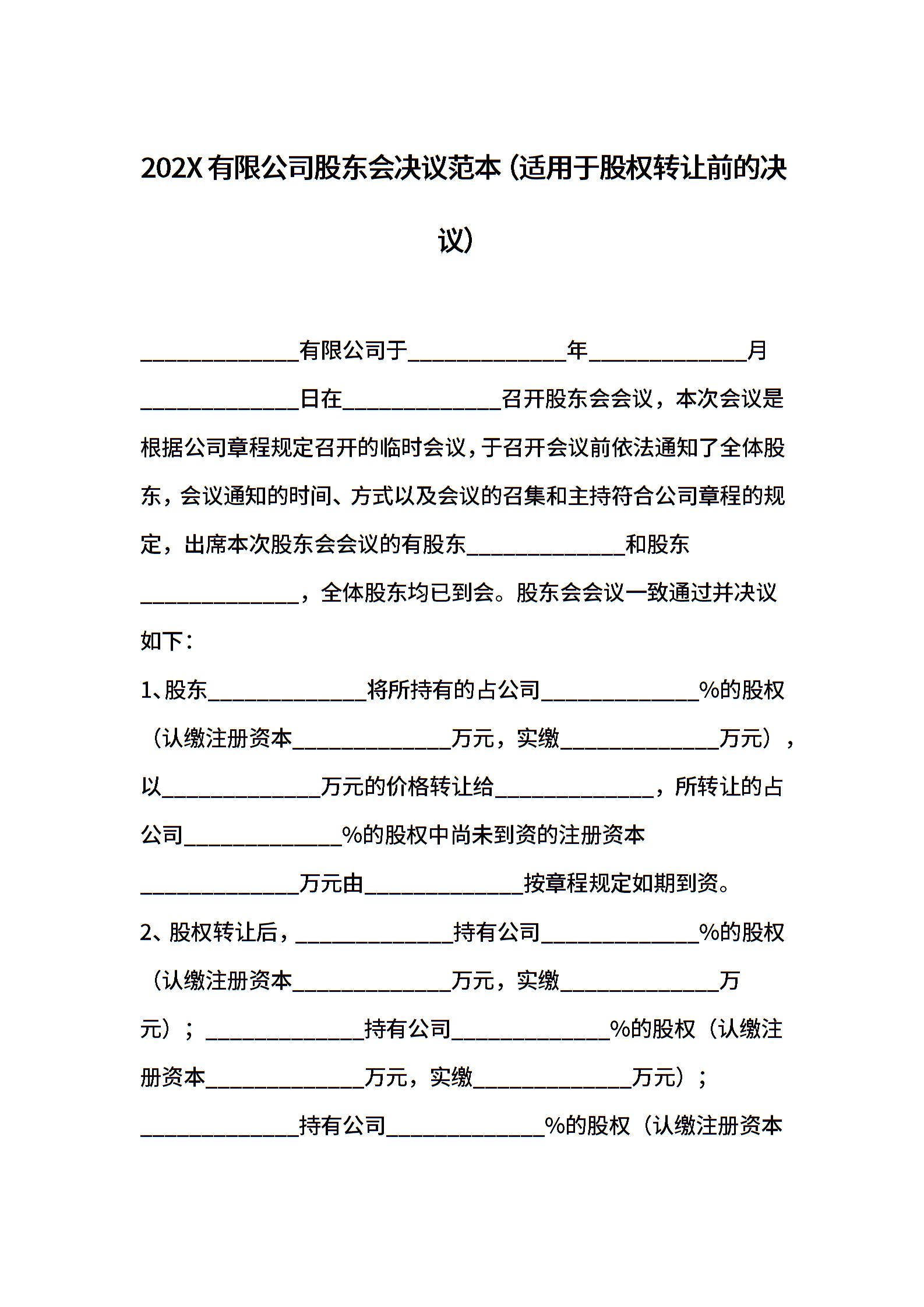 202X有限公司股东会决议范本(适用于股权转让前的决议)