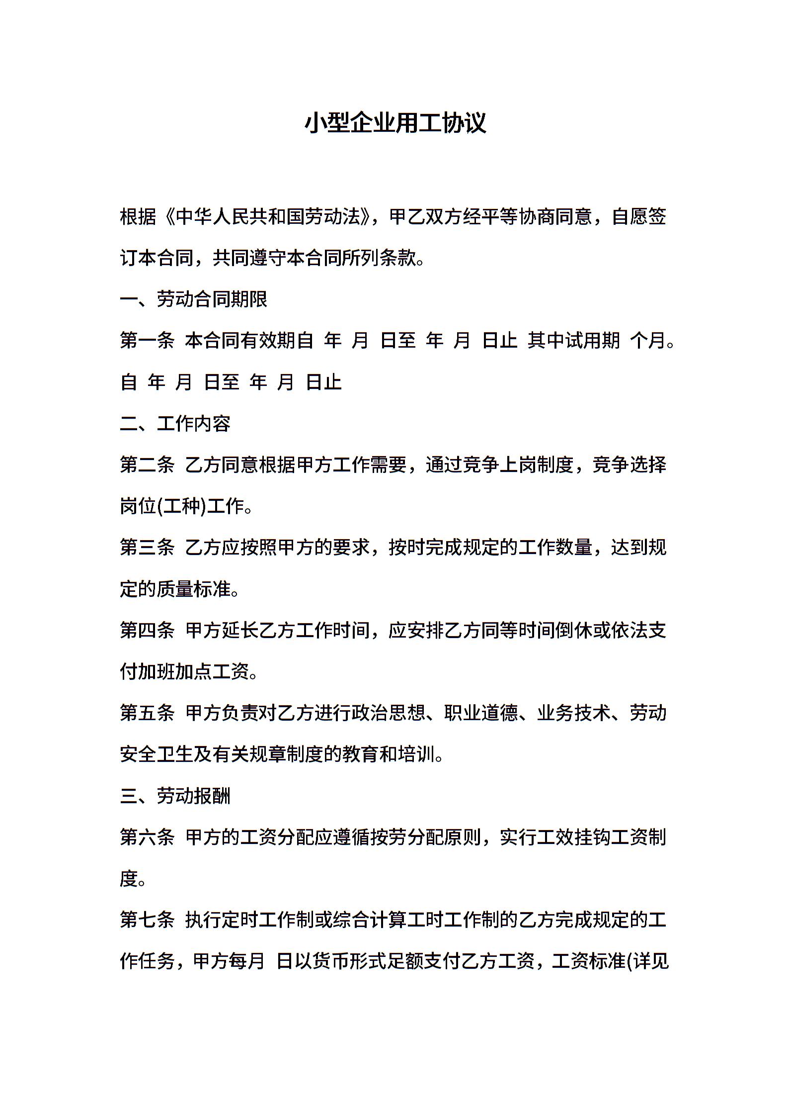 小型企业用工协议