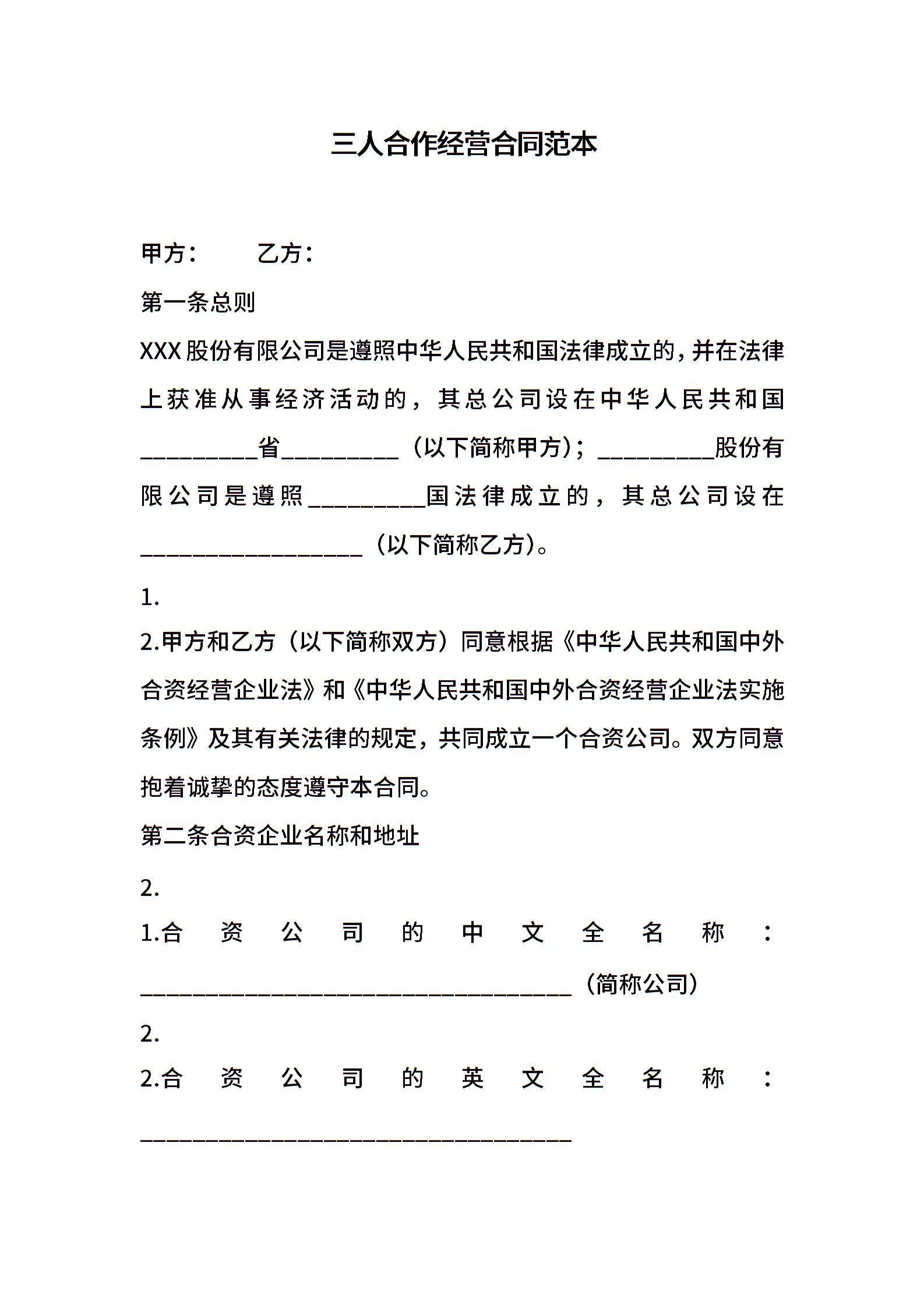 三人合作经营合同范本