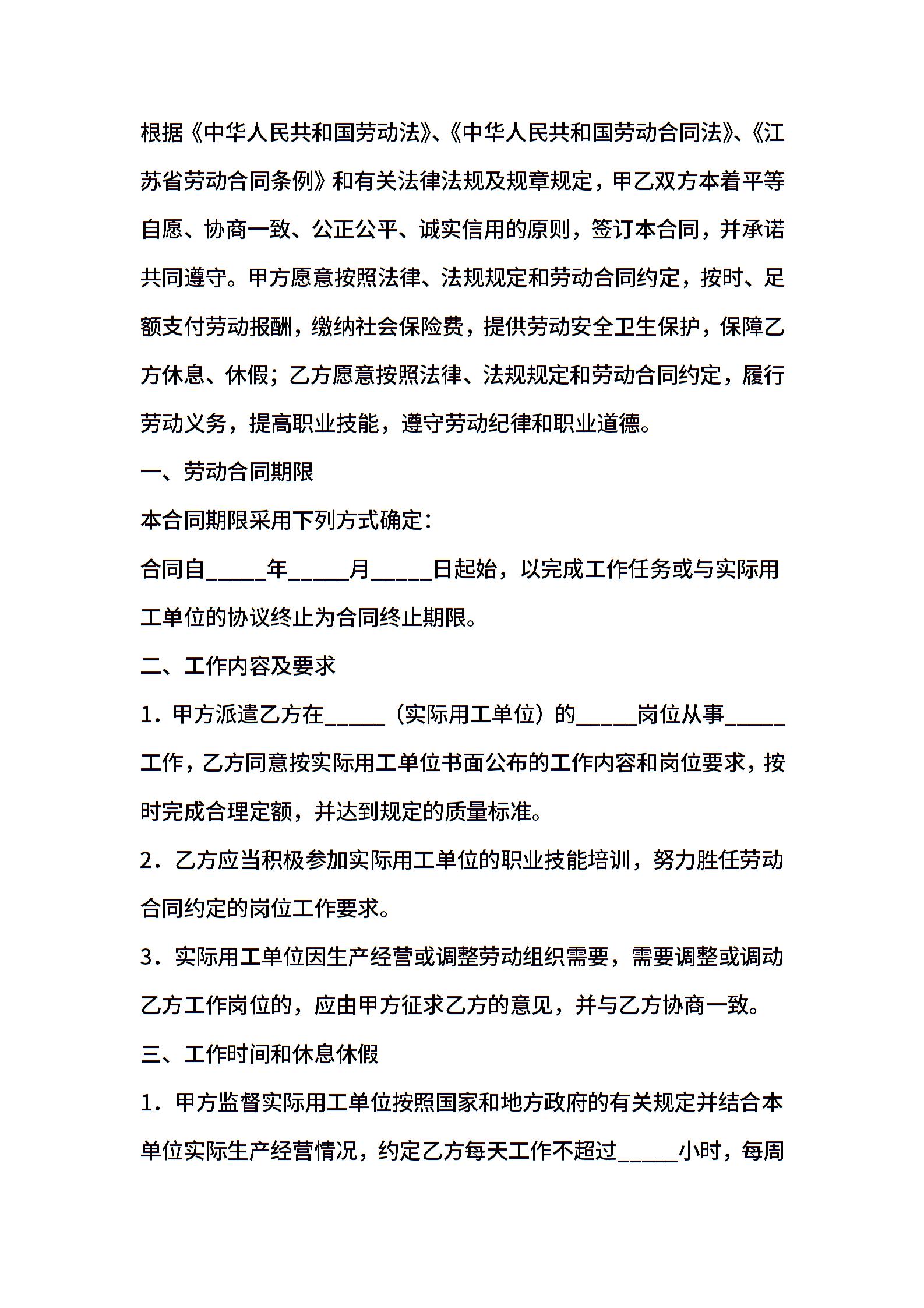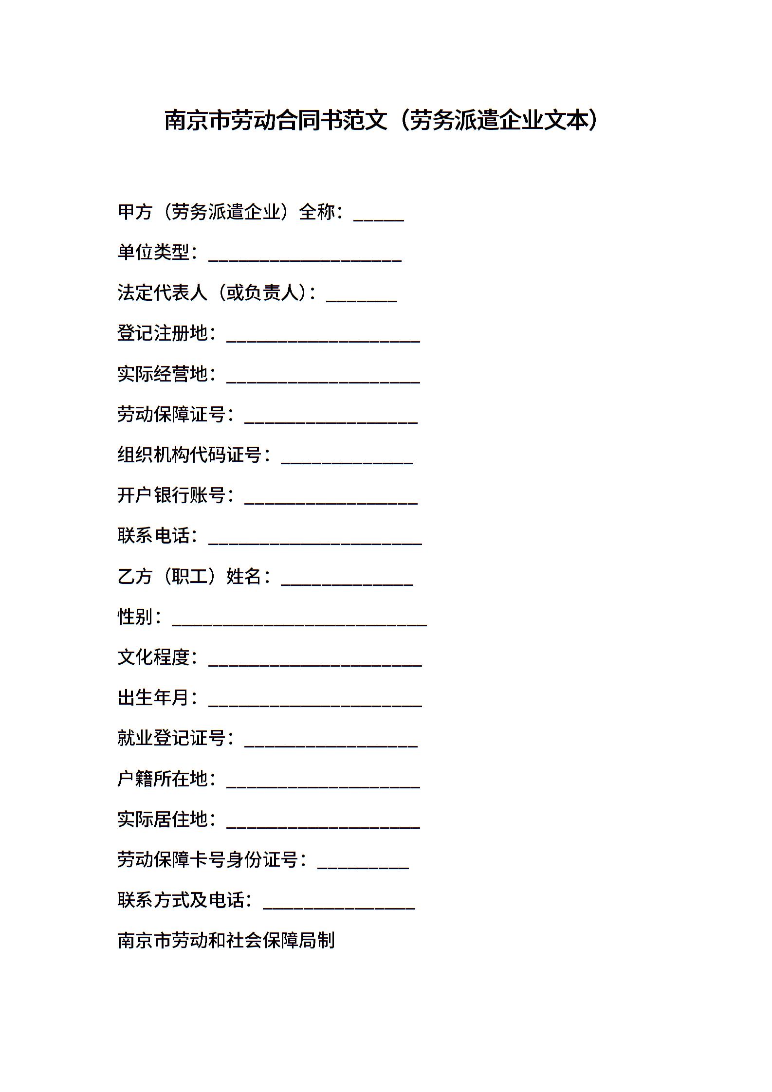 南京市劳动合同书范文(劳务派遣企业文本)