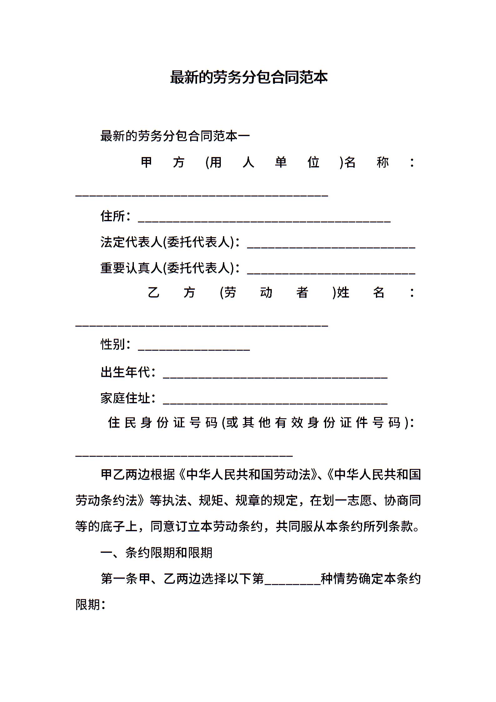 最新的劳务分包合同范本