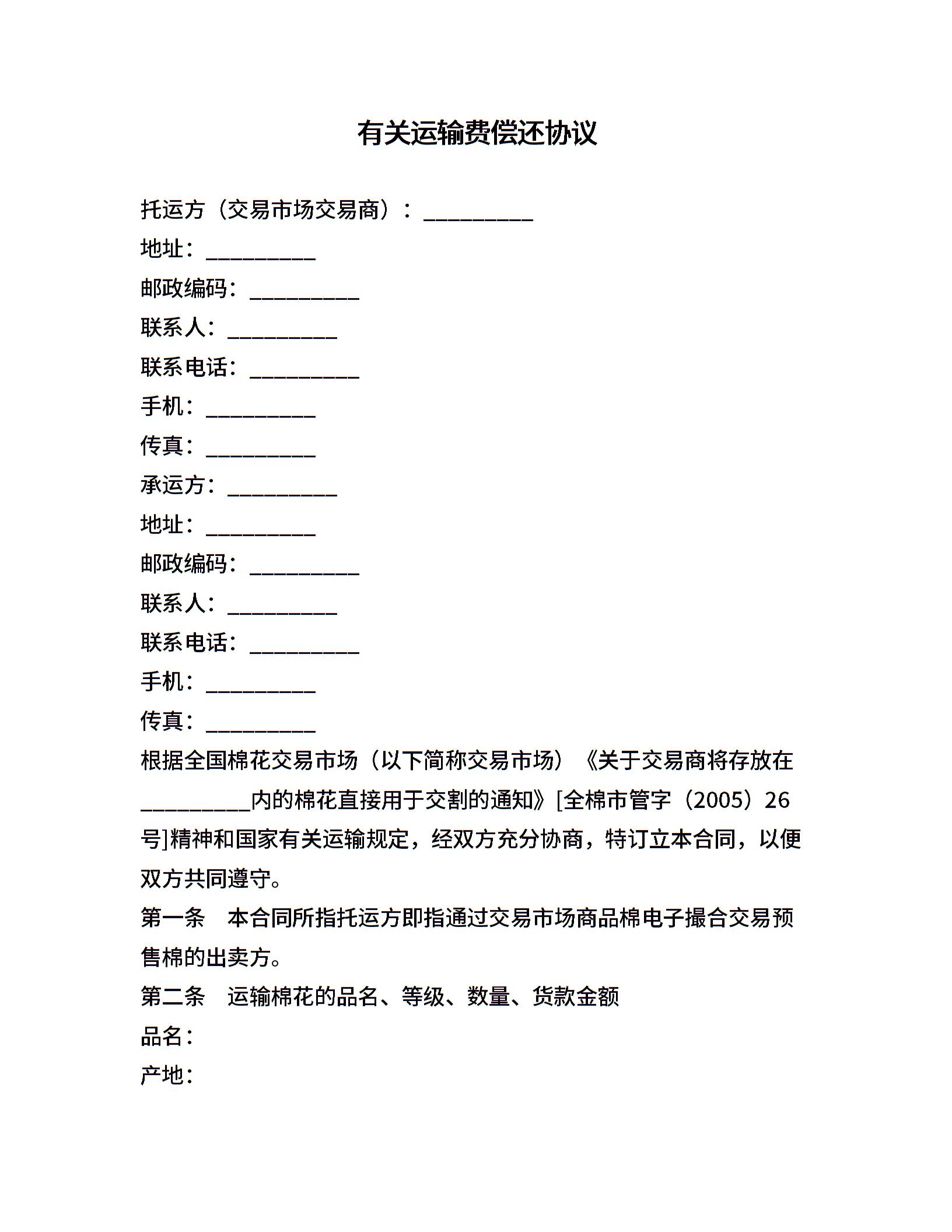 有关运输费偿还协议