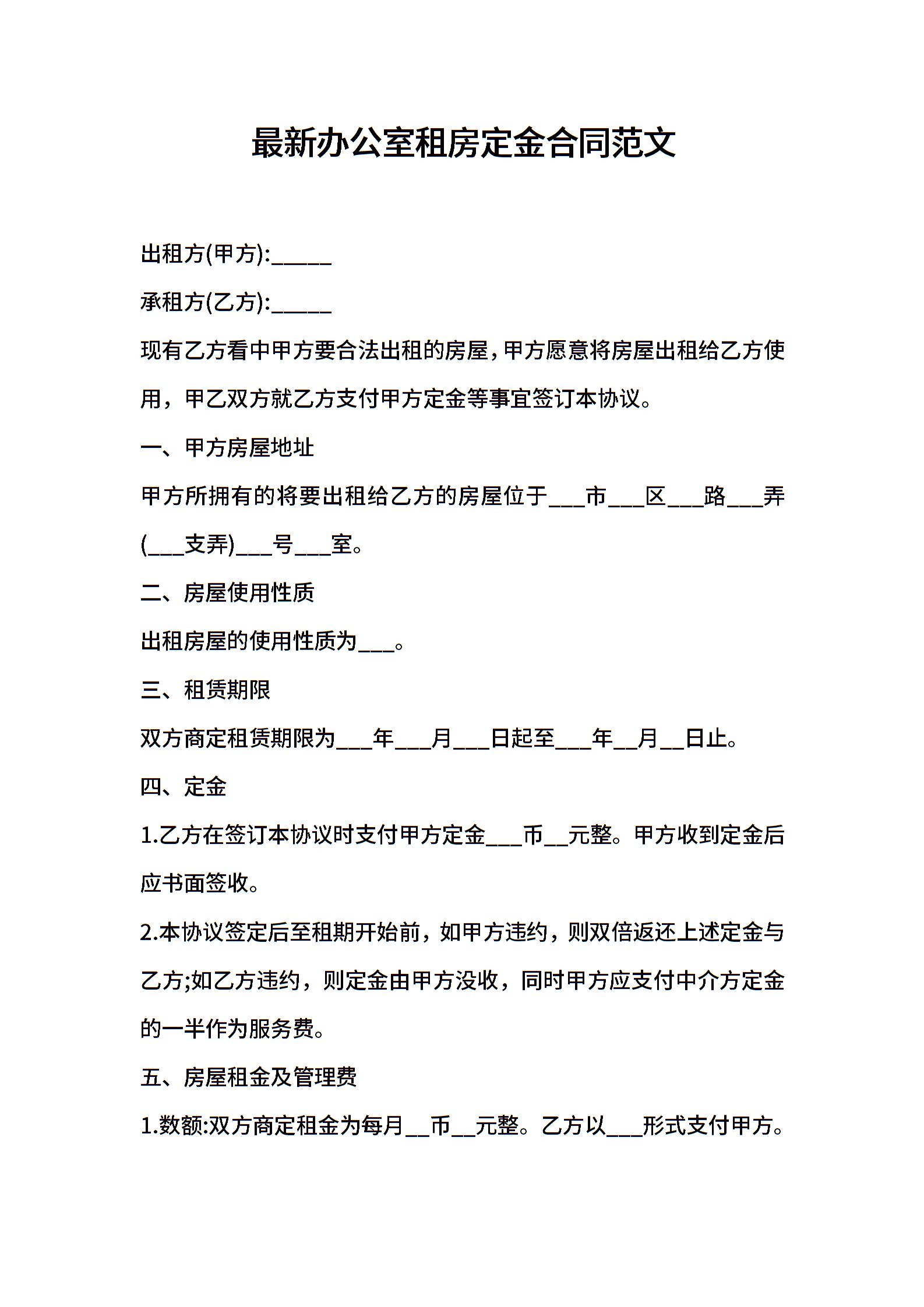 最新办公室租房定金合同范文