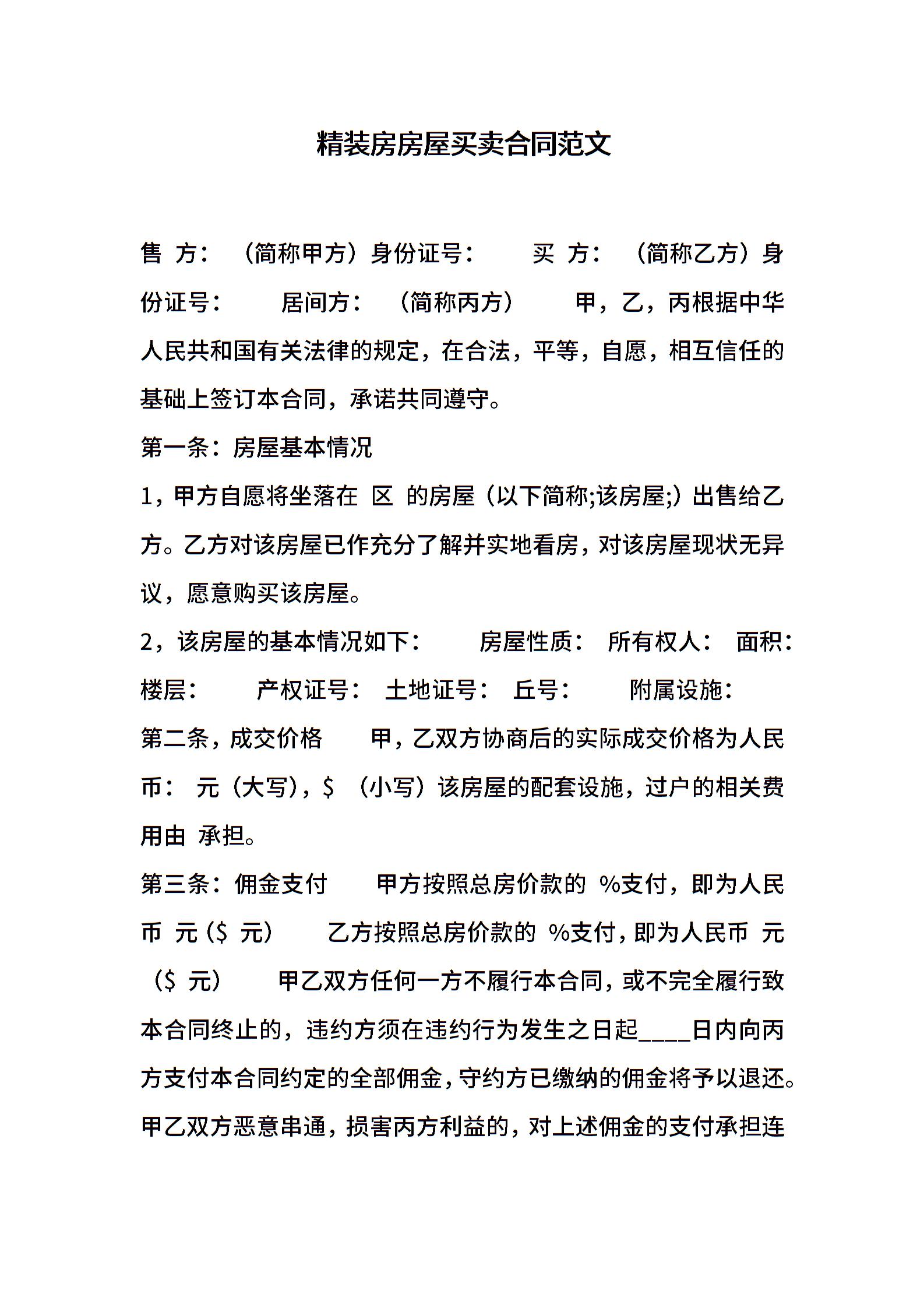 精装房房屋买卖合同范文
