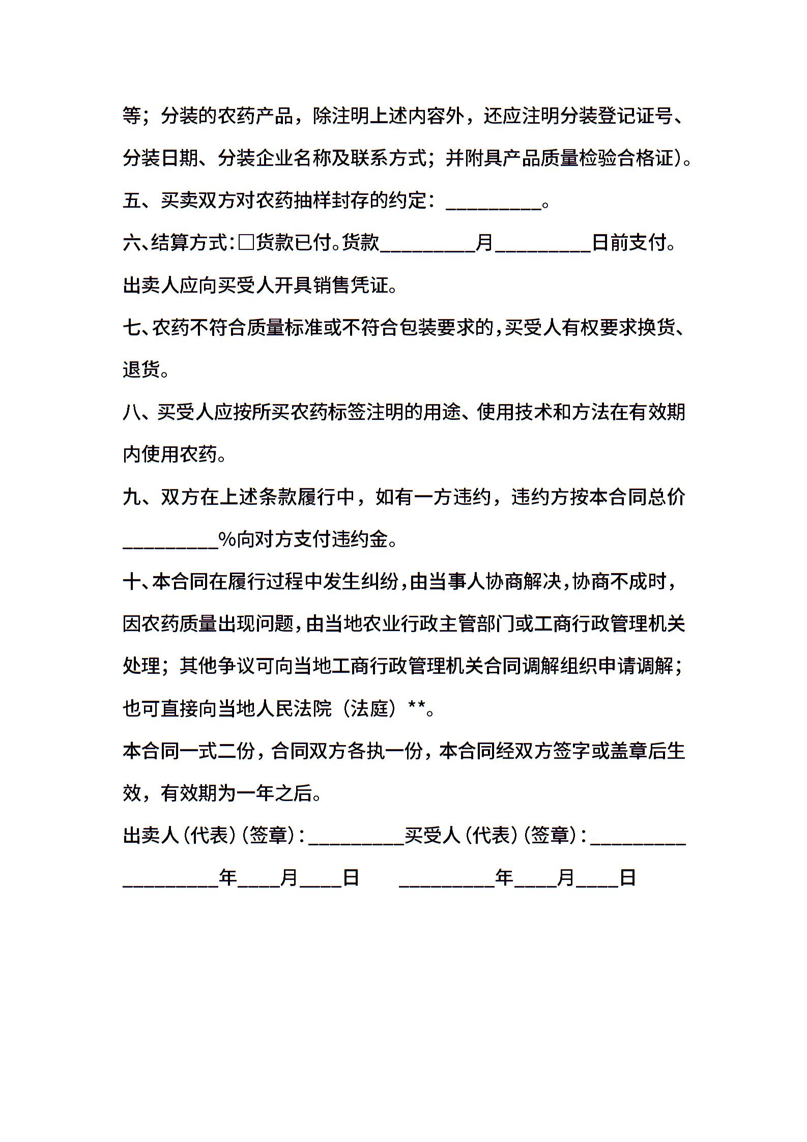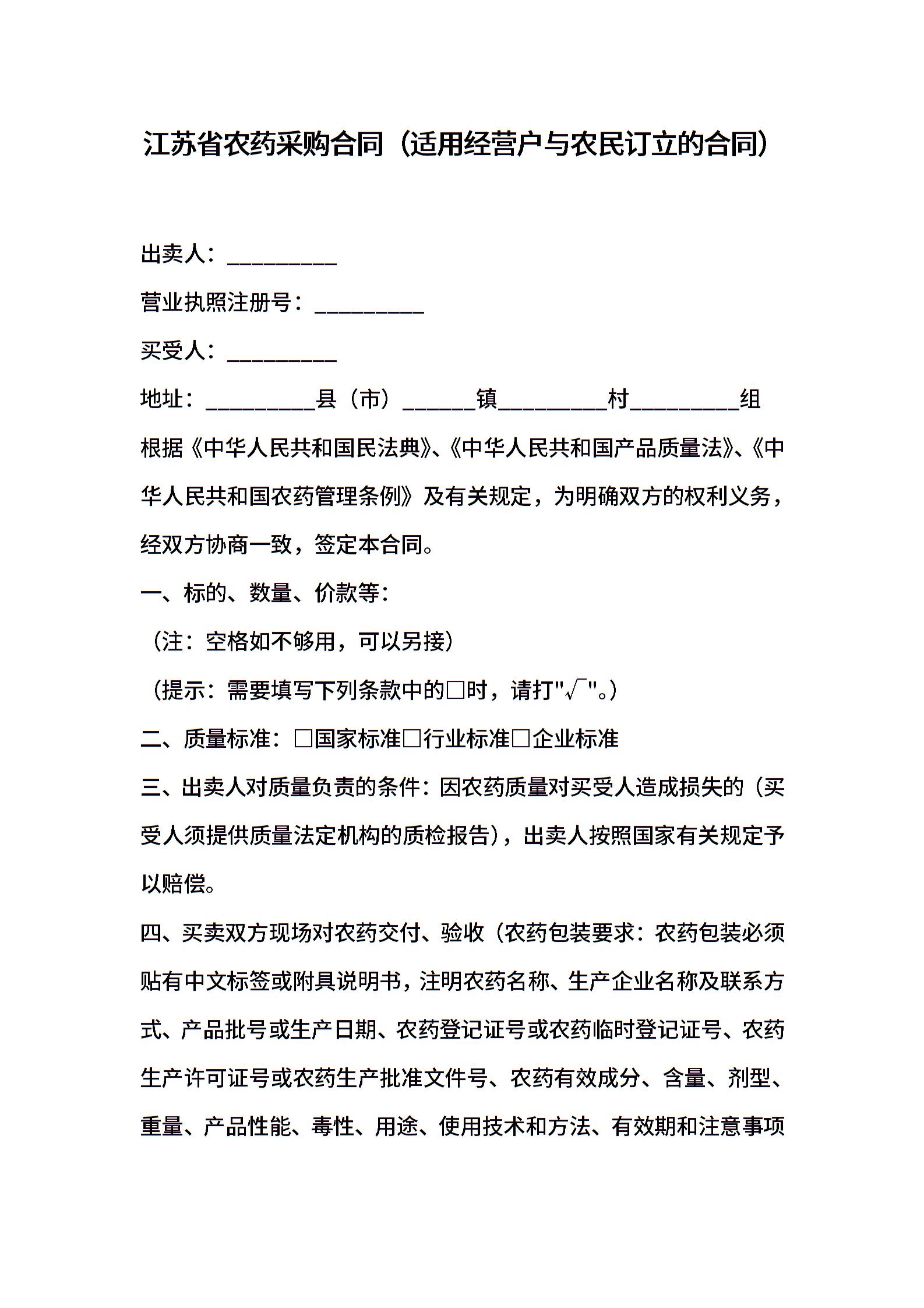 江苏省农药采购合同(适用经营户与农民订立的合同)
