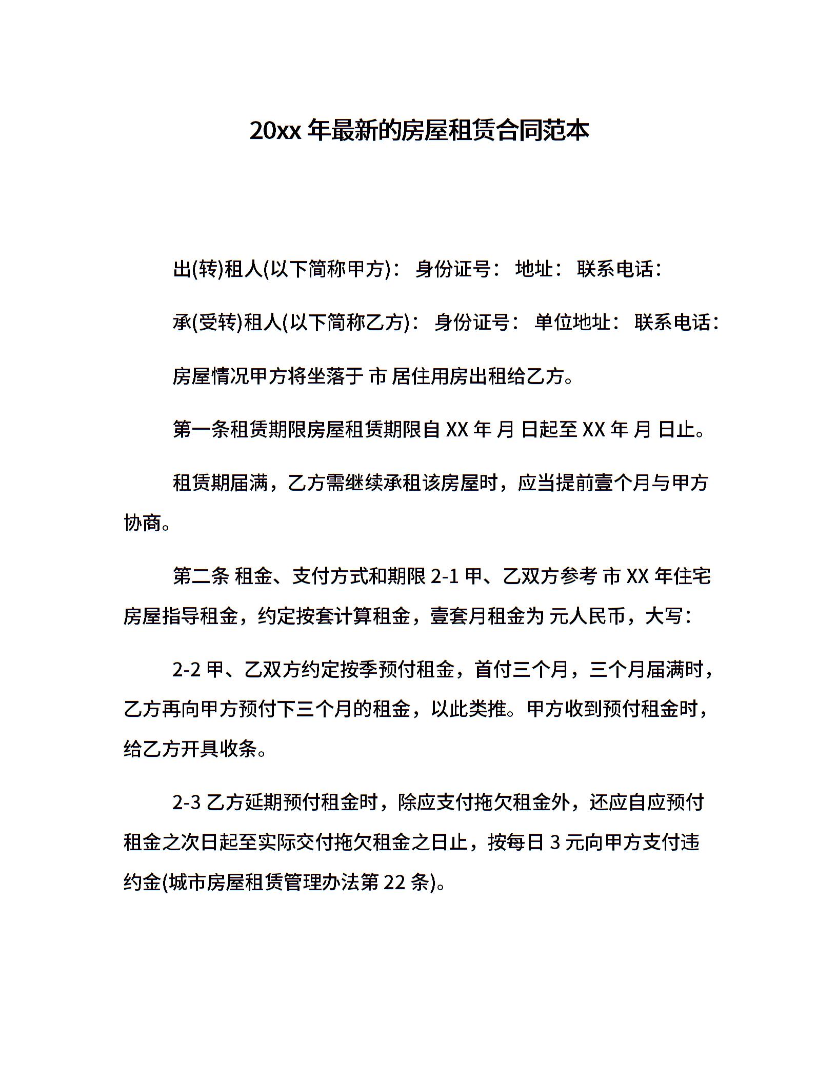 20xx年最新的房屋租赁合同范本