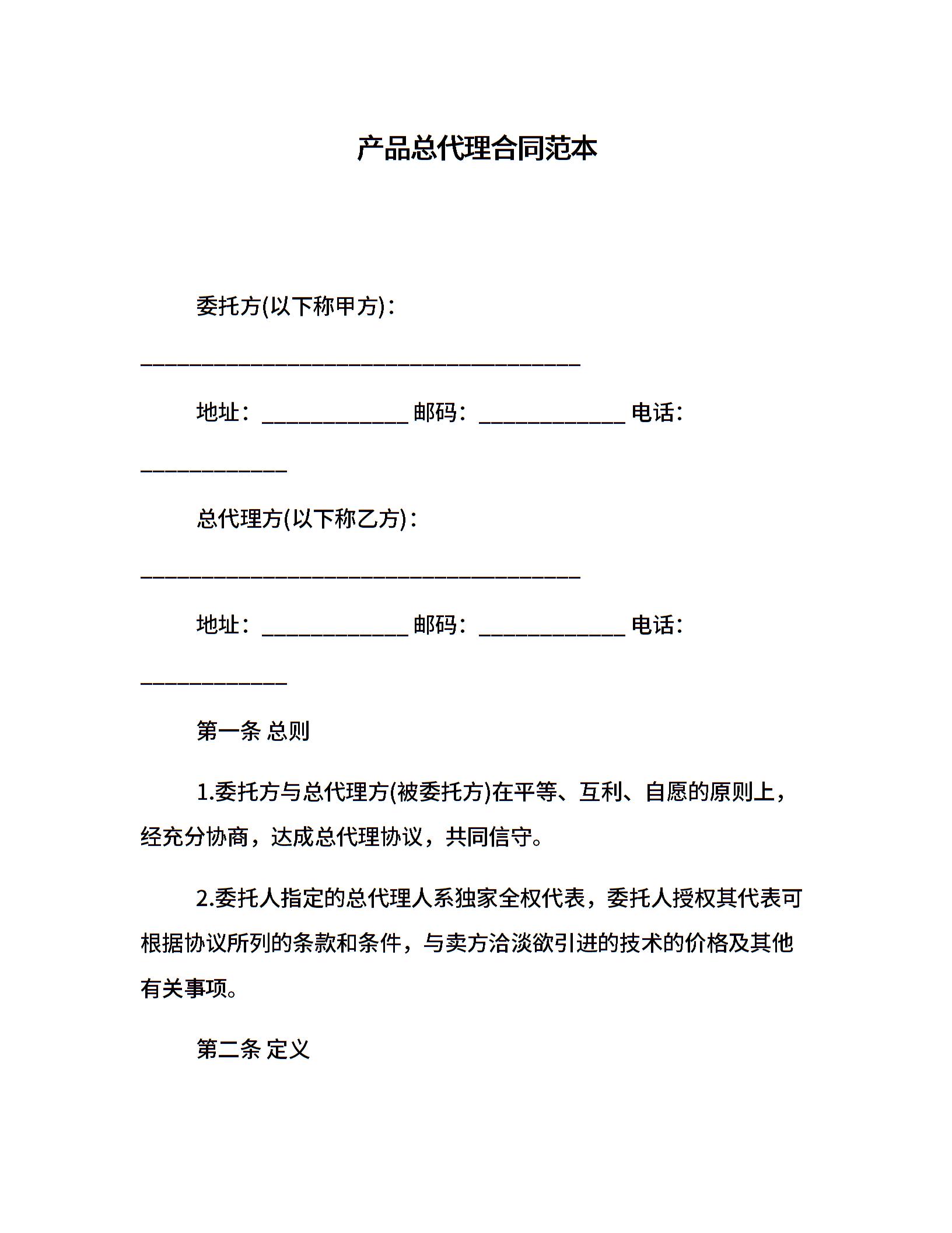 产品总代理合同范本