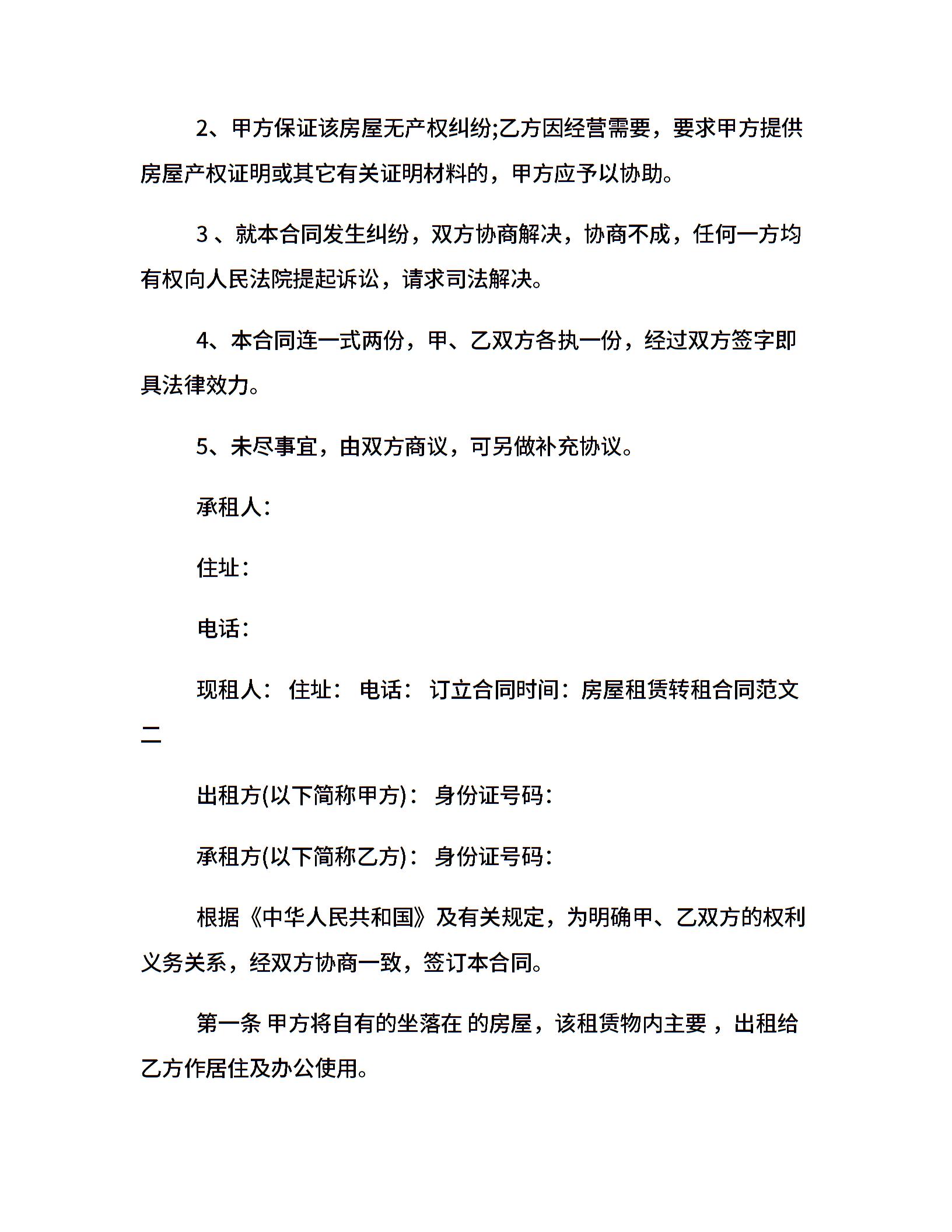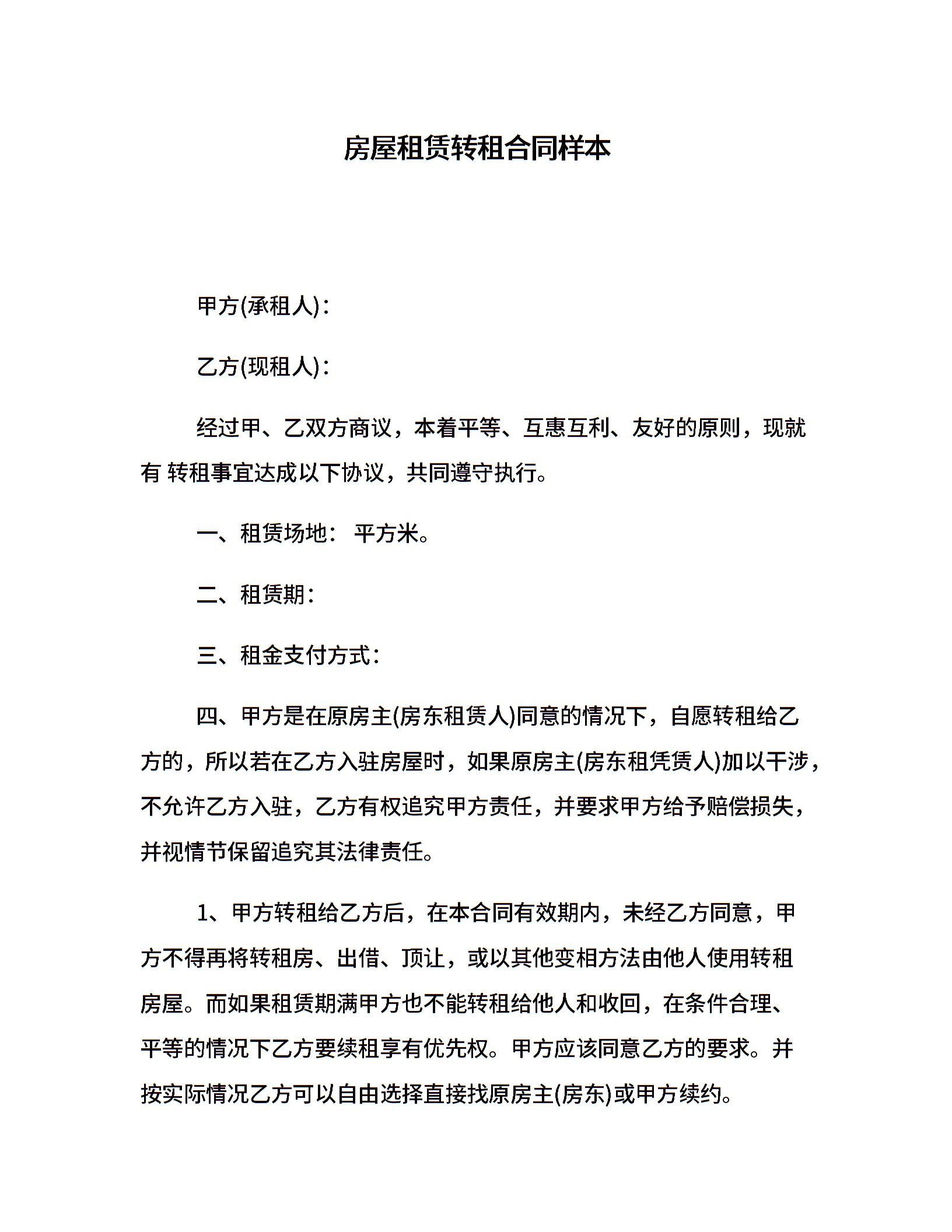 房屋租赁转租合同样本