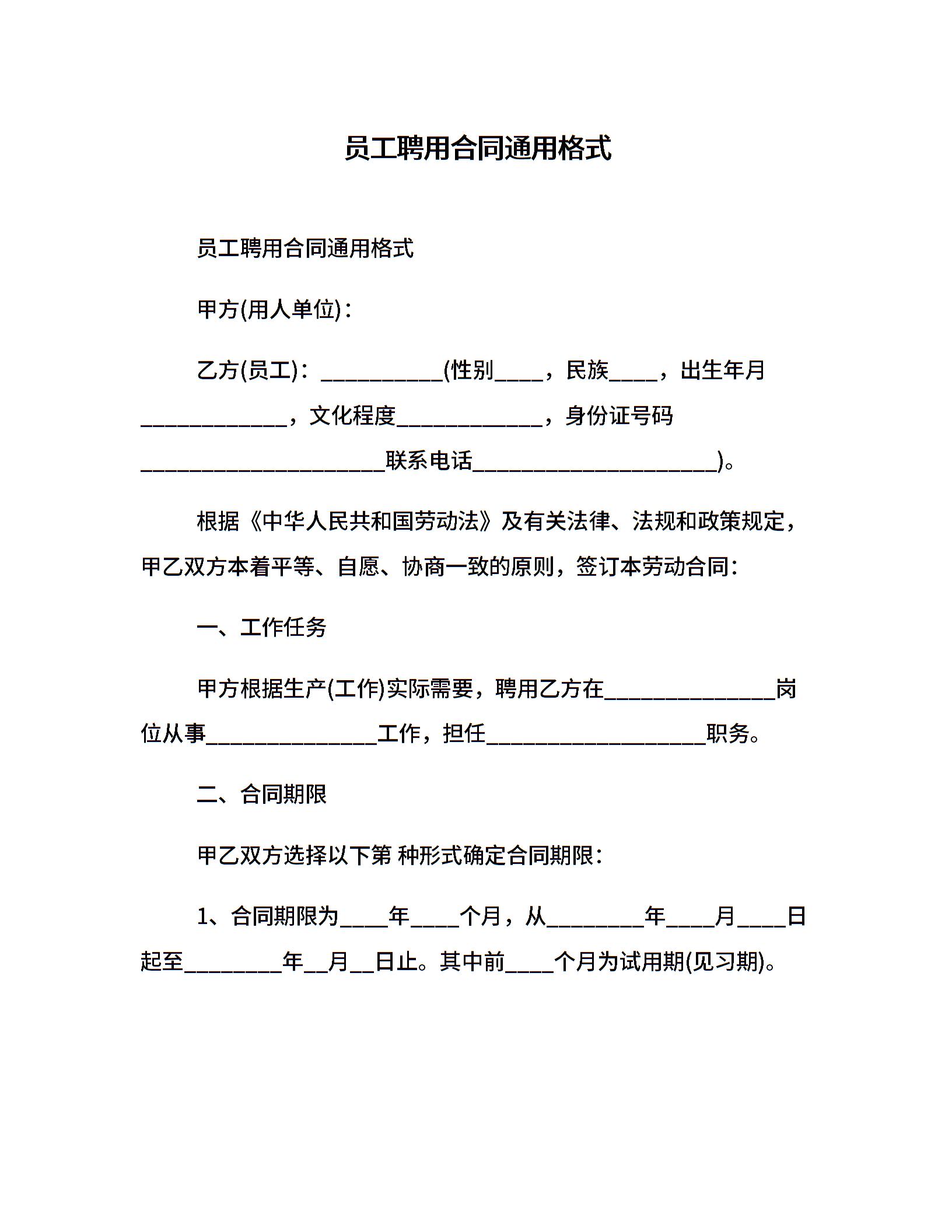 员工聘用合同通用格式