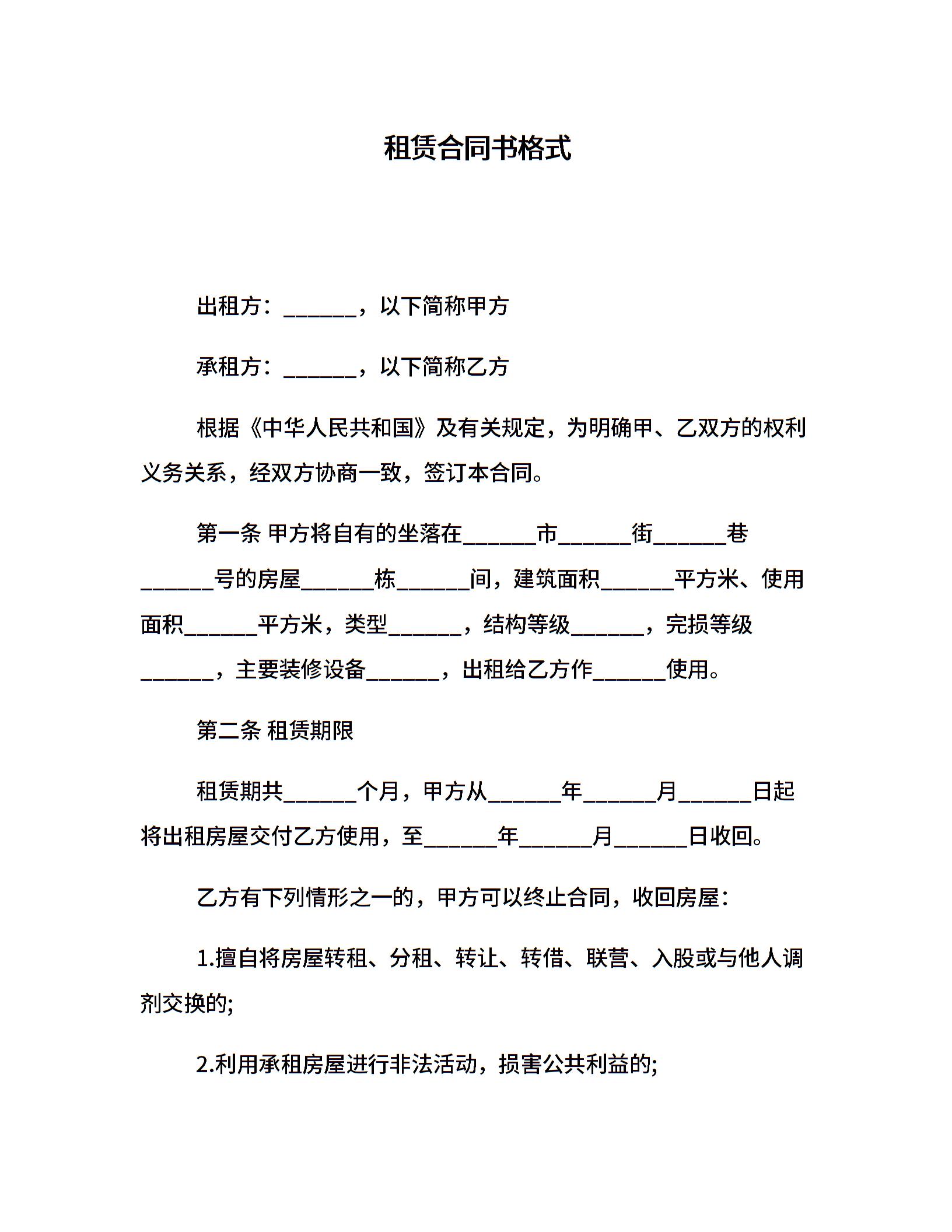 租赁合同书格式