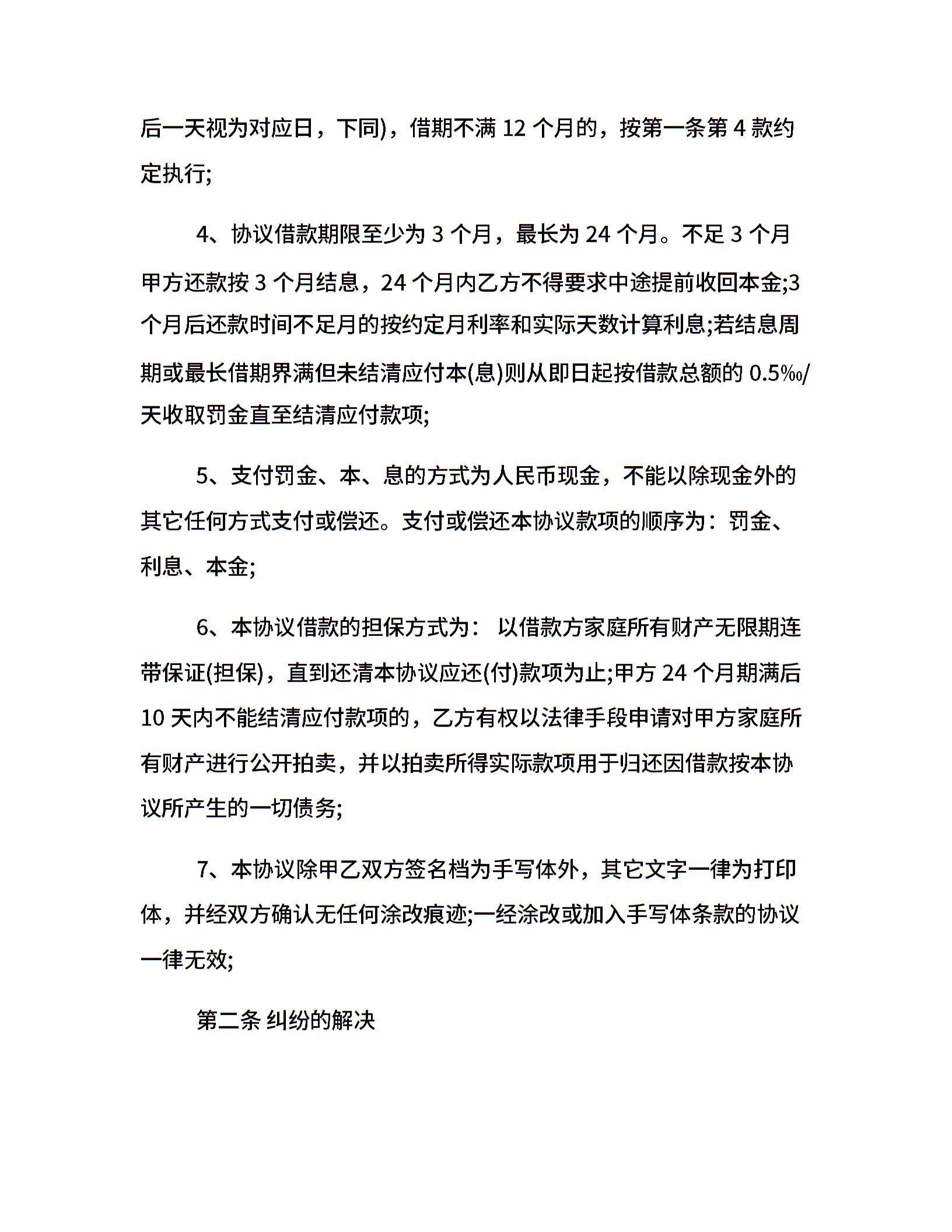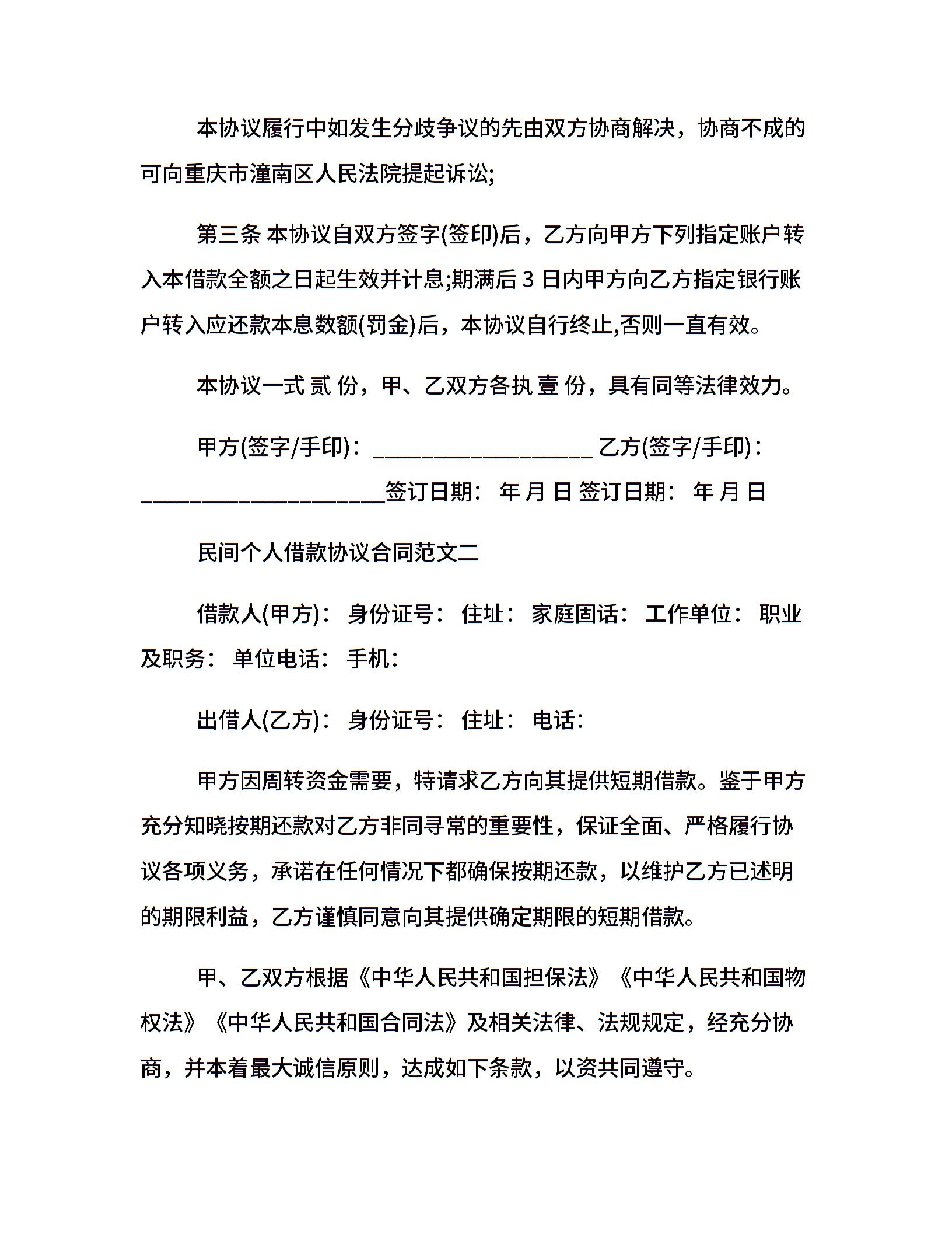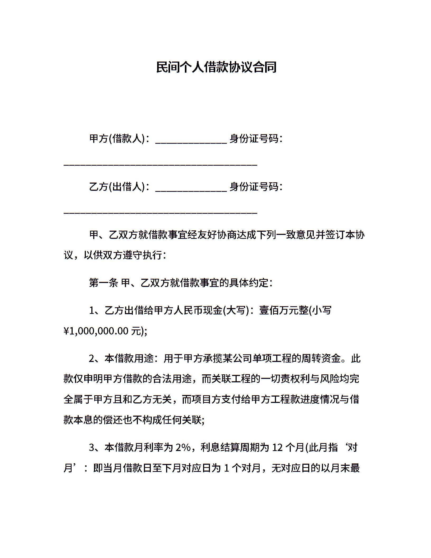 民间个人借款协议合同