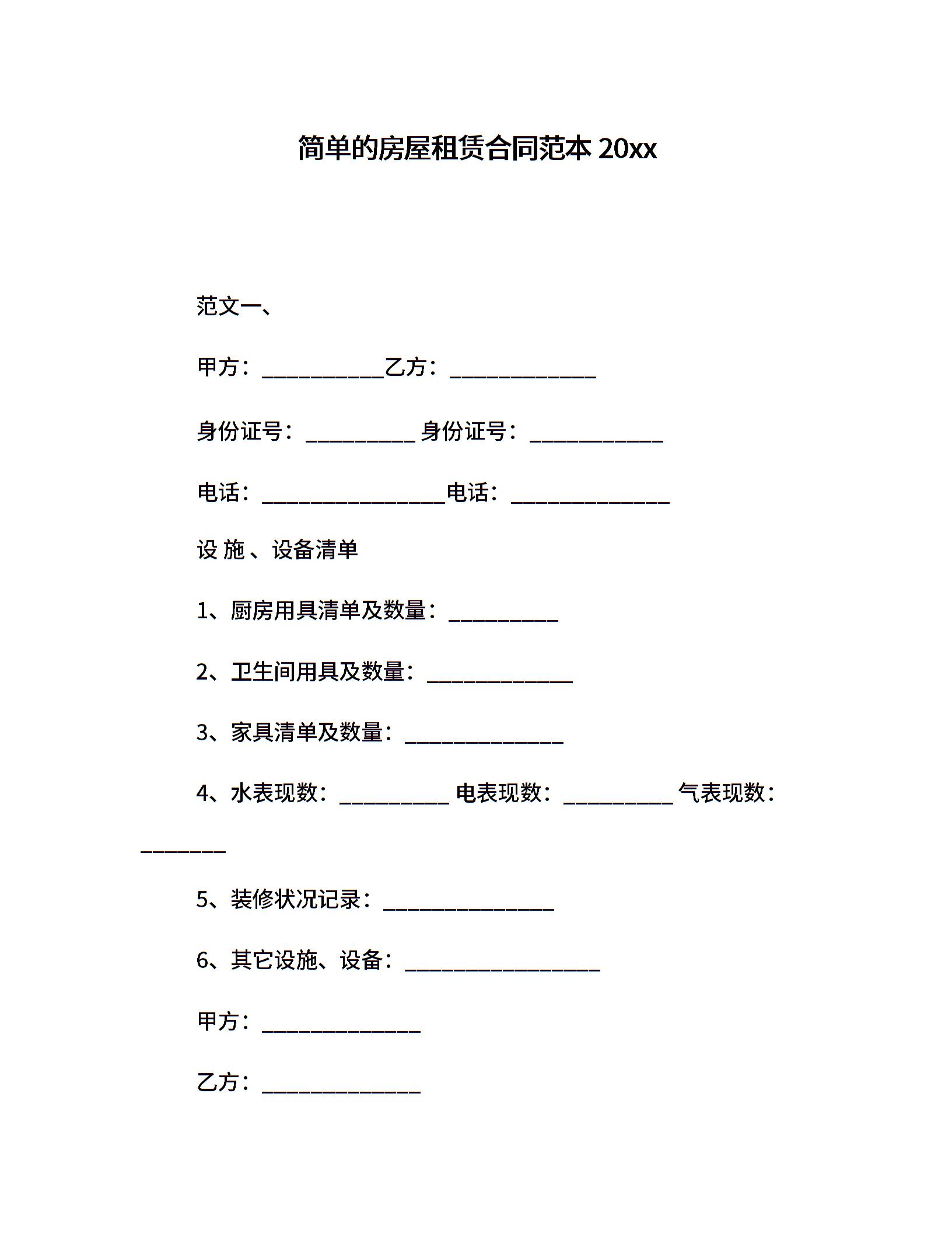简单的房屋租赁合同范本20xx