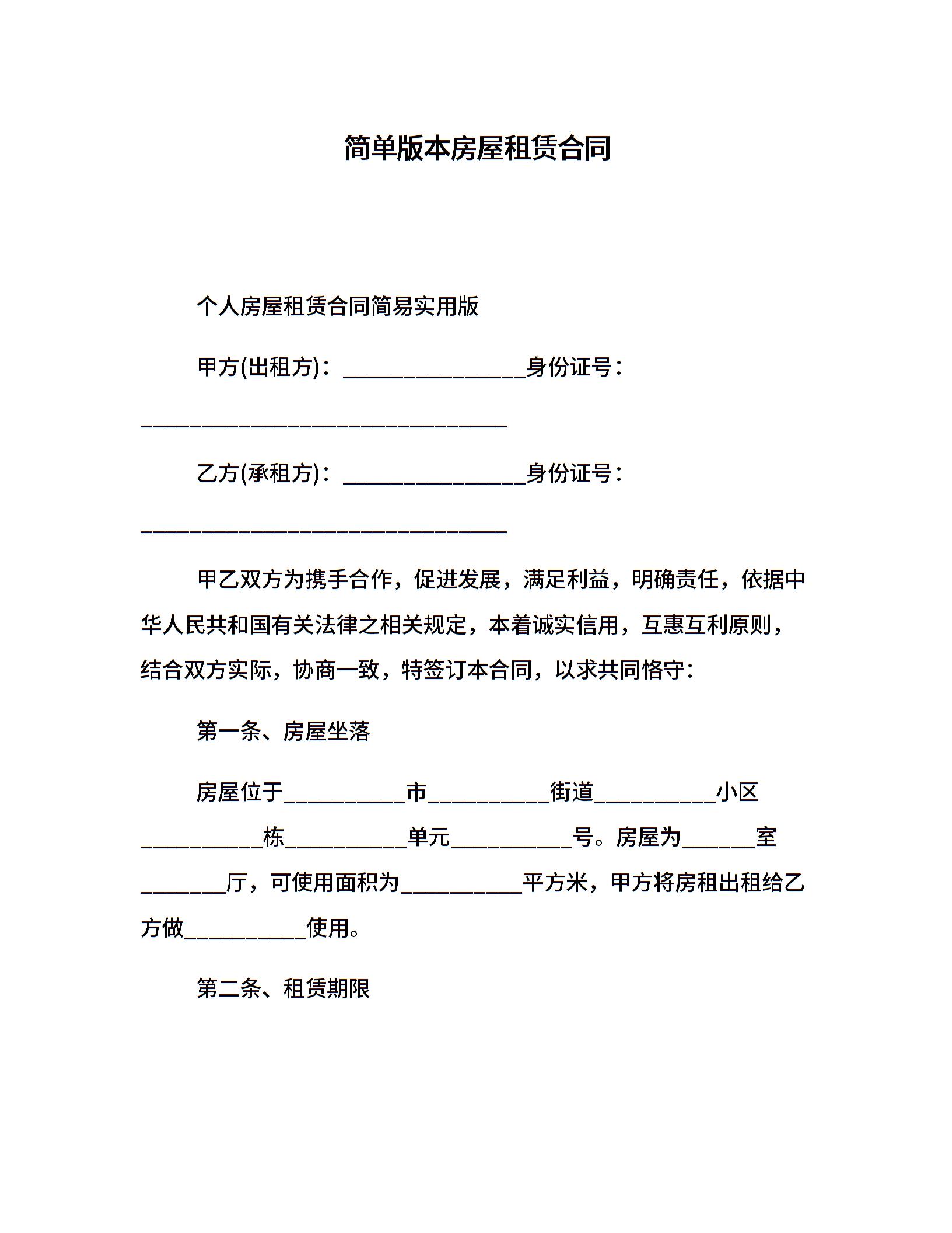简单版本房屋租赁合同