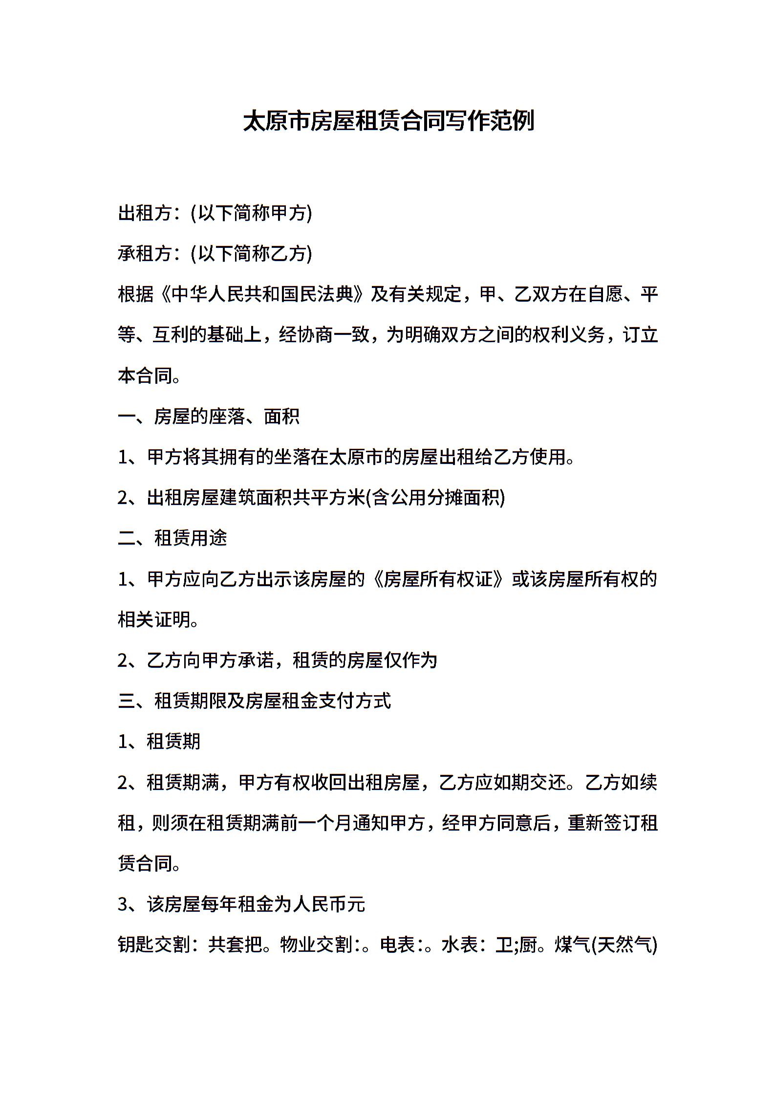 太原市房屋租赁合同写作范例