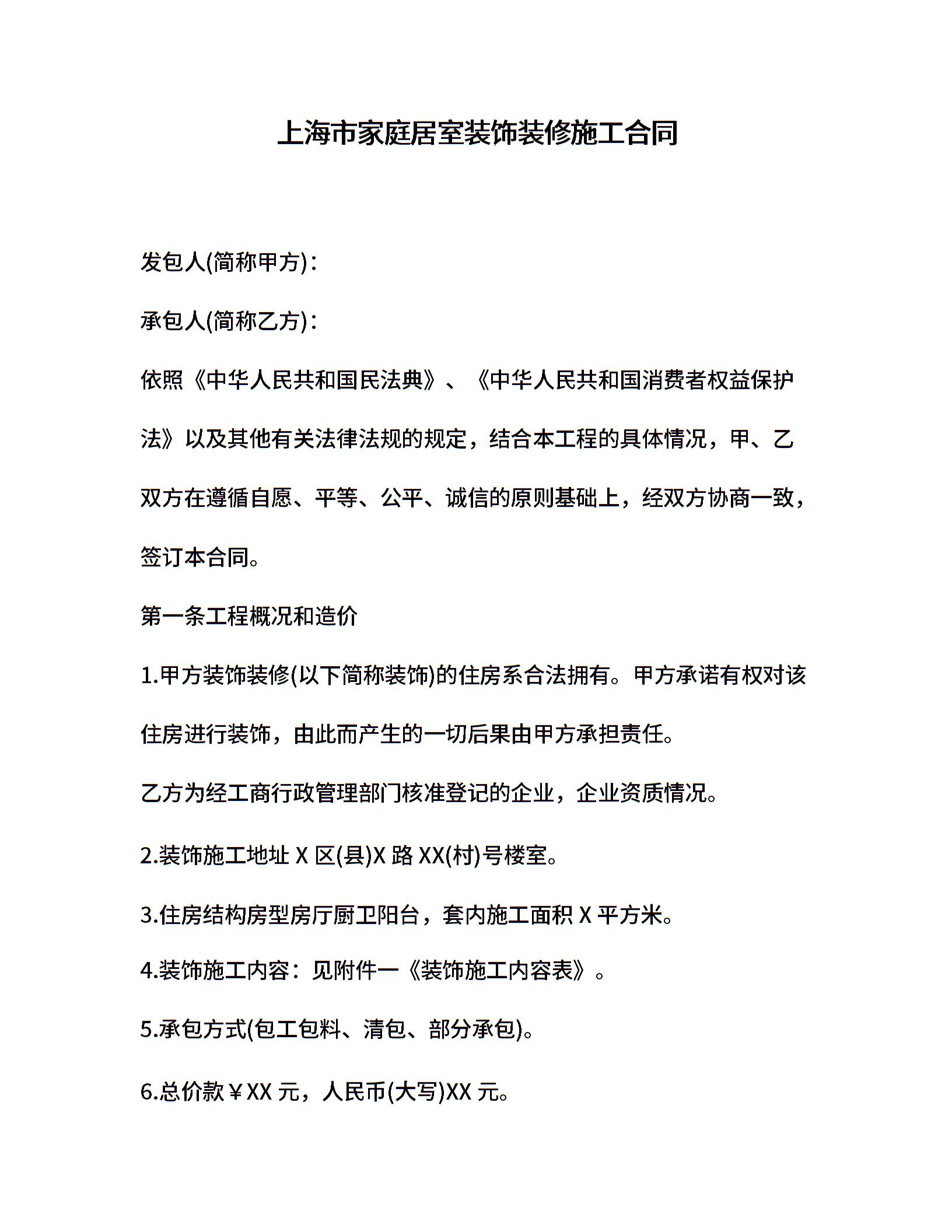 上海市家庭居室装饰装修施工合同