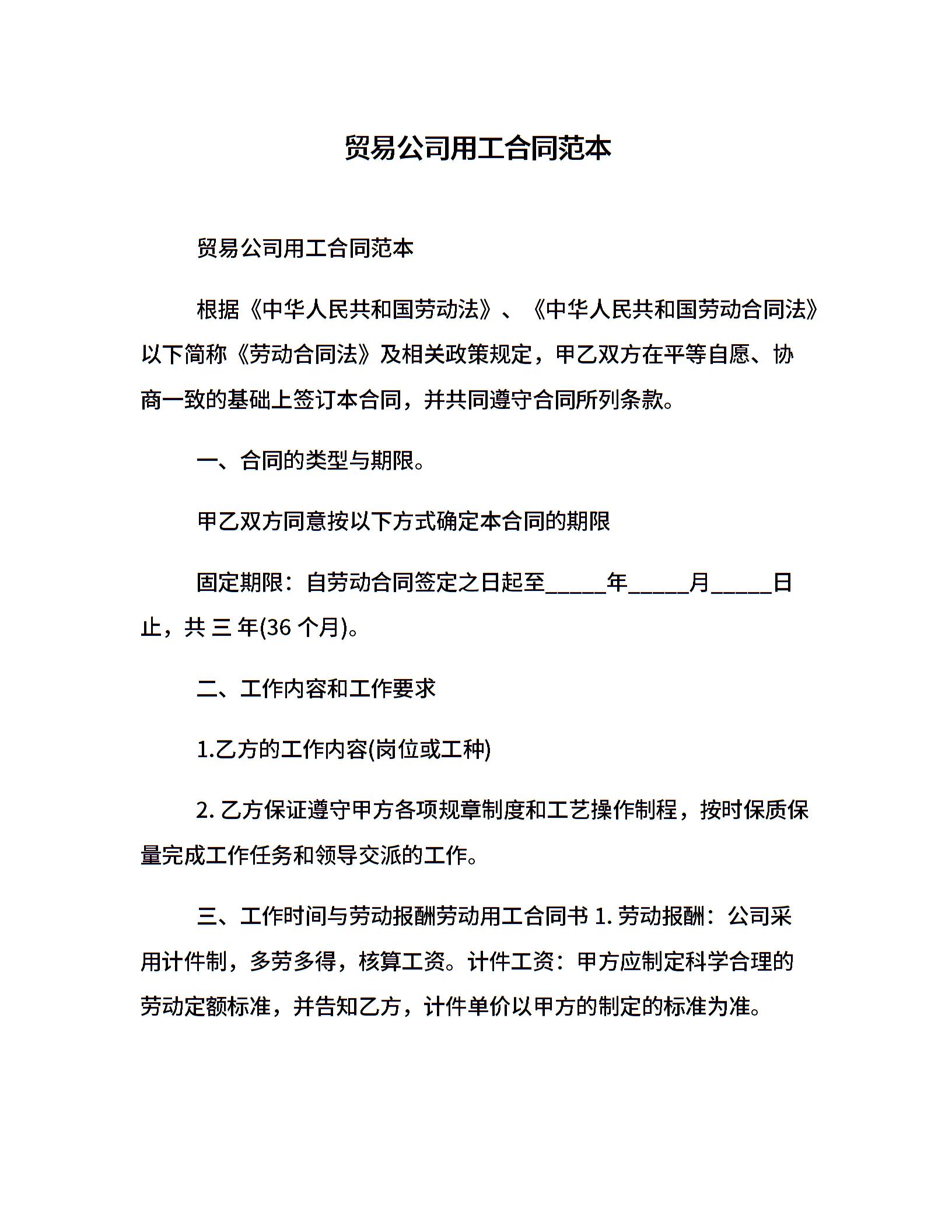 贸易公司用工合同范本